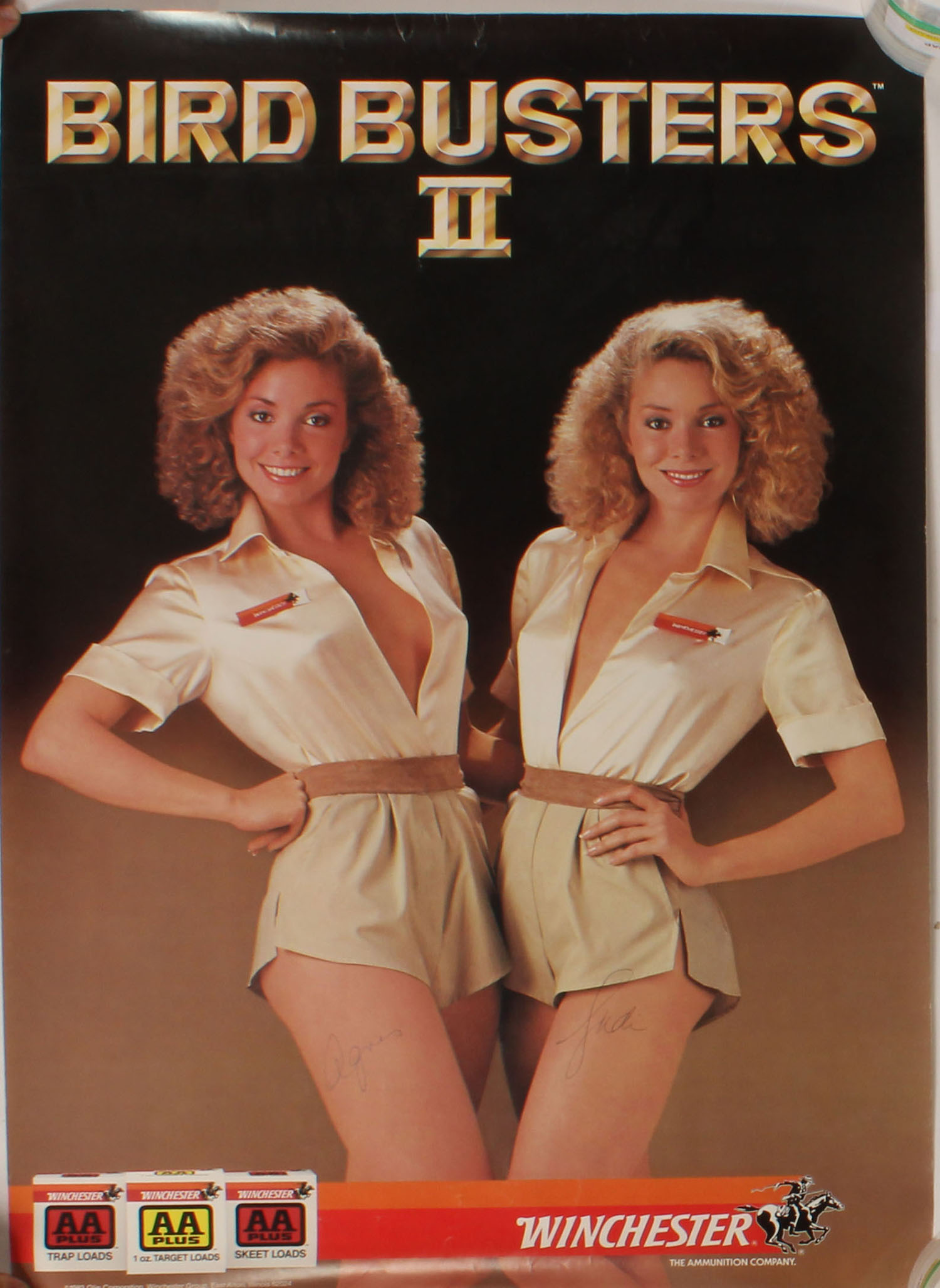 Winchester BIRD BUSTER II AA PLUS SIGNED Poster, pictures two lady's with shotshell boxes, 17'' x 28''. Grade: Excellent - Value: 50 to 150