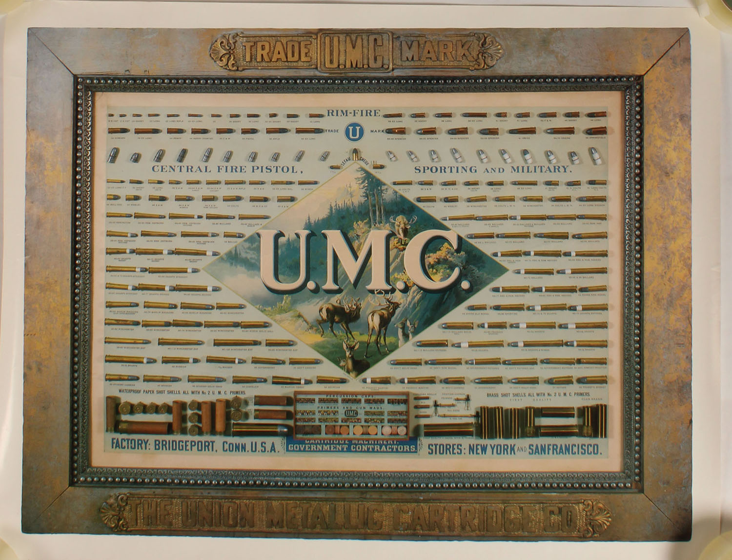 UMC cartridge board poster, pictures the elk in the center, 33'' x 25''. The poster is an image of a frame, not framed. Grade: Excellent - Value: 10 to 50