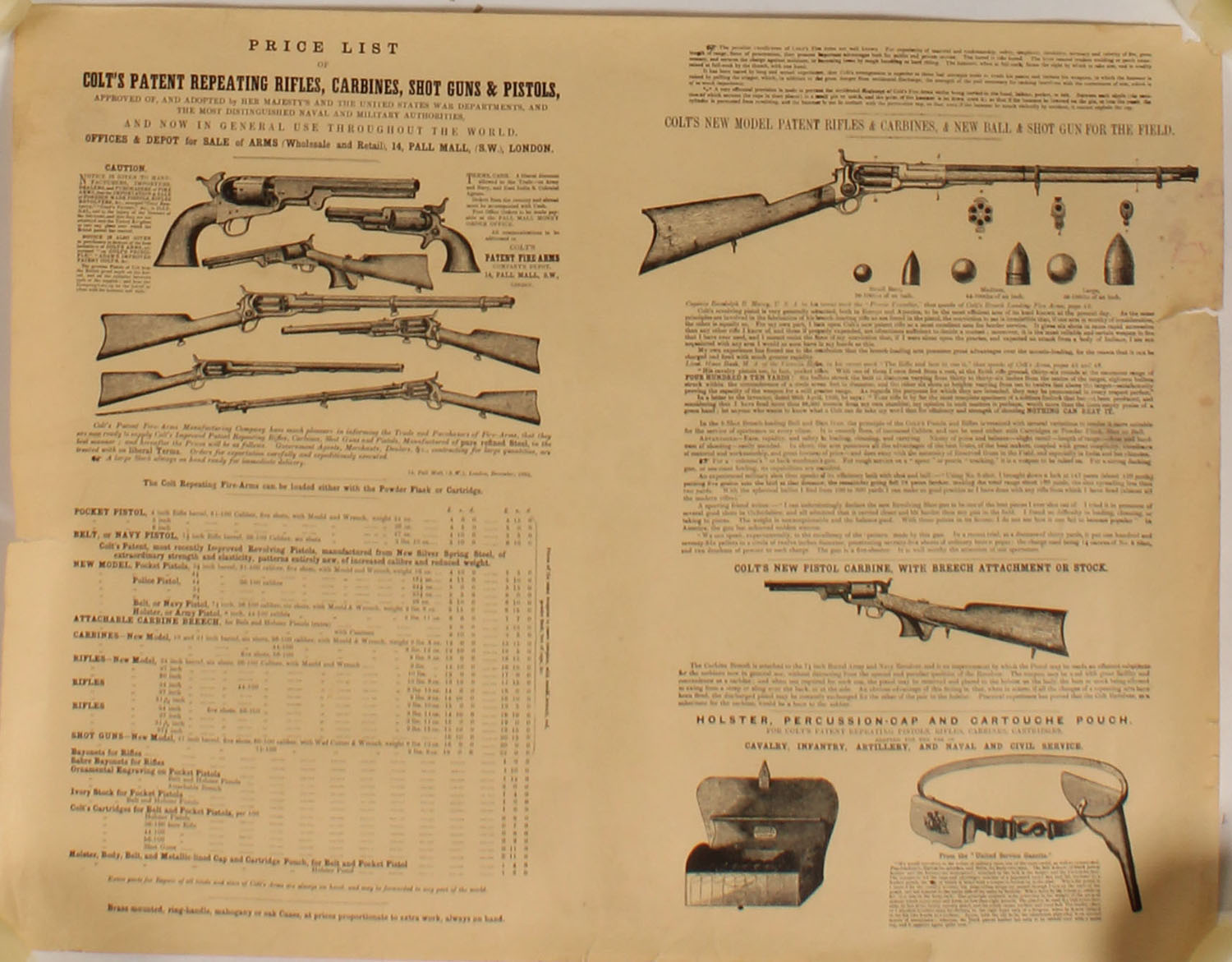 Colt poster pictures price list & photos of early colt pistols & revolving rifle, 21'' x 17'', we don't believe this to be old. Grade: Very Good - Value: 6 to 30