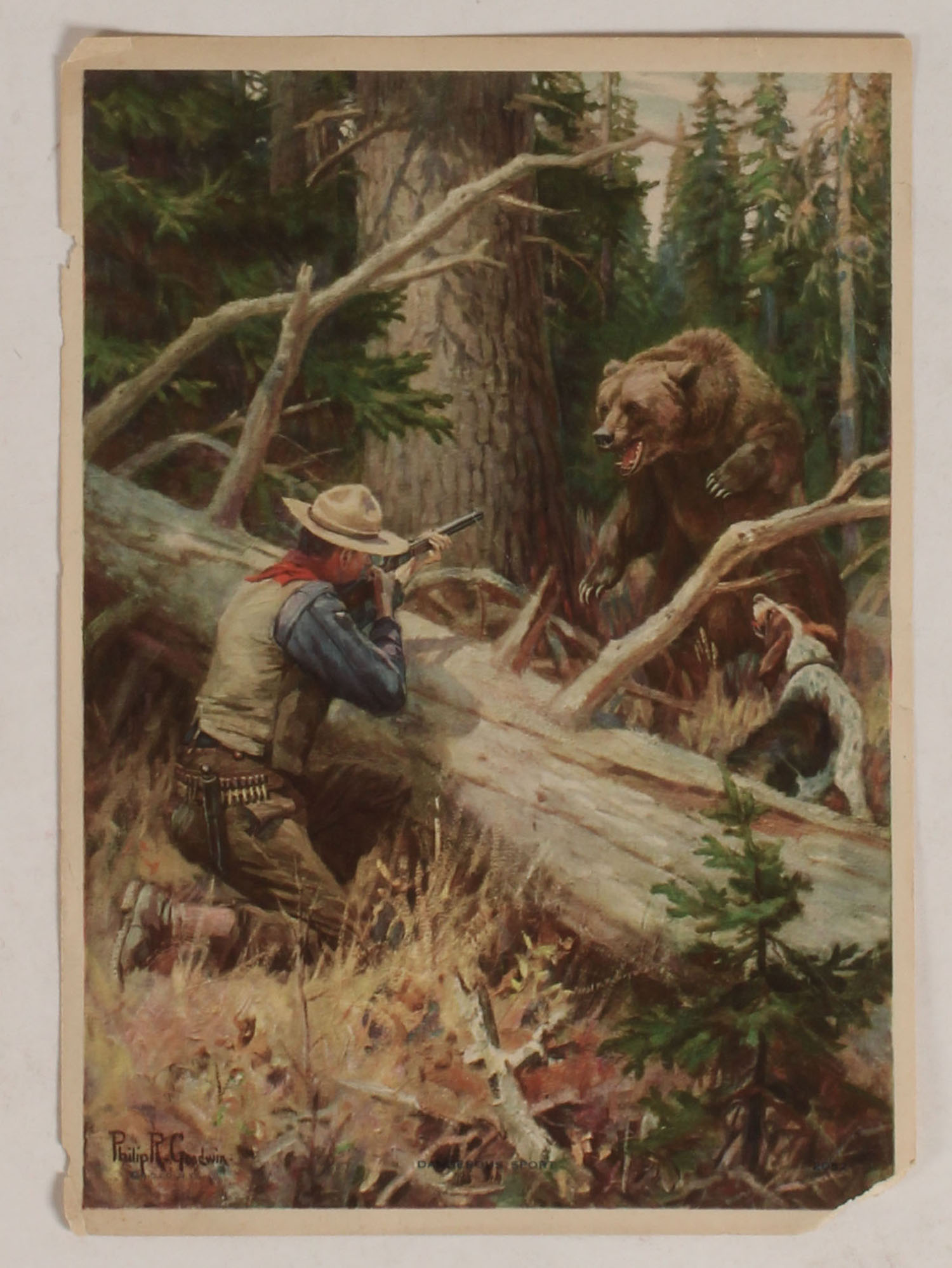Philip R Goodwin print, Dangerous Sport, pictures hunter shooting at grizzly bear in the woods at close quarters, 8'' x 11''. Grade: Very Good - Value: 10 to 80