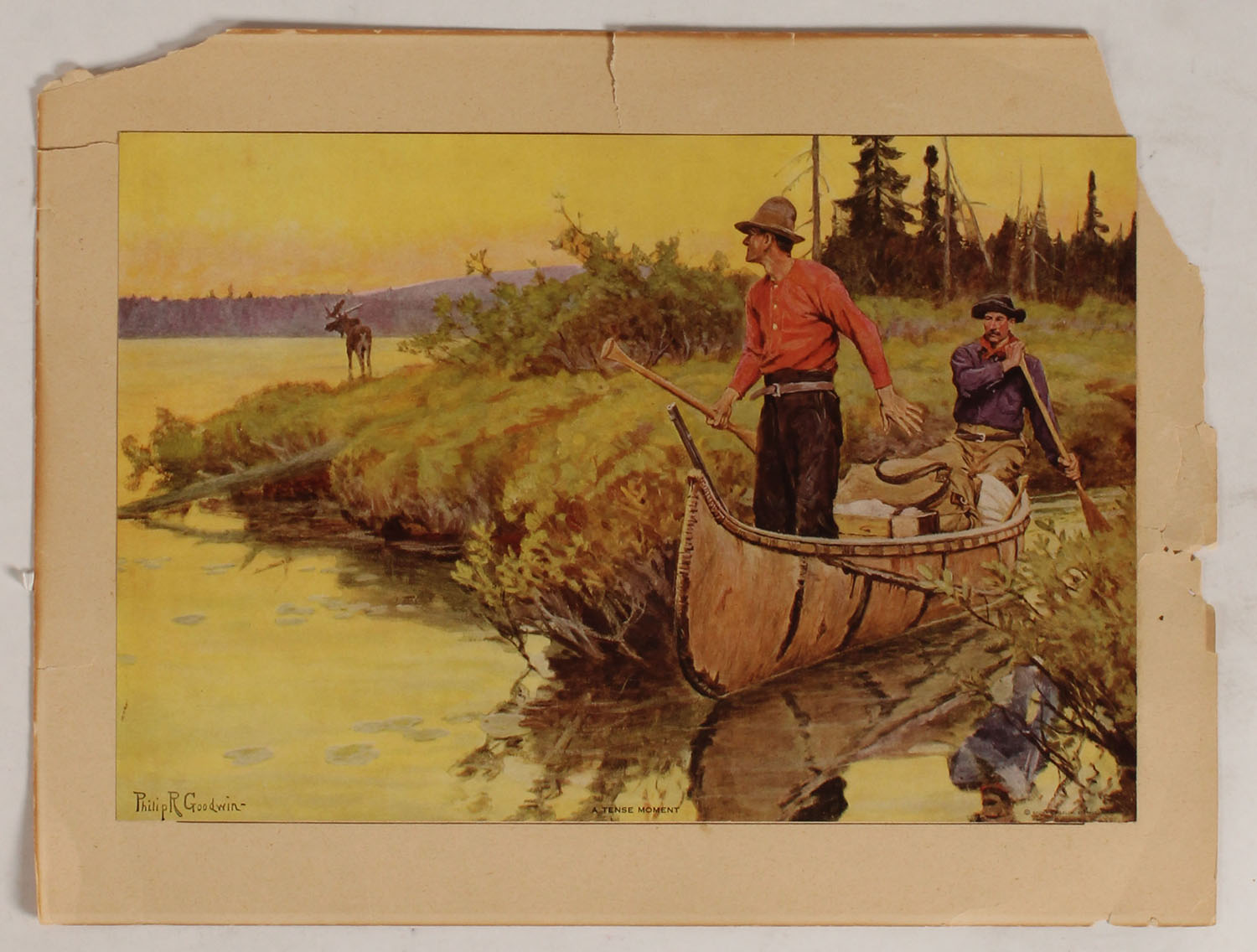 Philip R Goodwin print, A Tense Moment, pictures moose hunters in birch canoe with bull moose in background, 13 5/8'' X 9 1/4''. Grade: Very Good - Value: 20 to 80