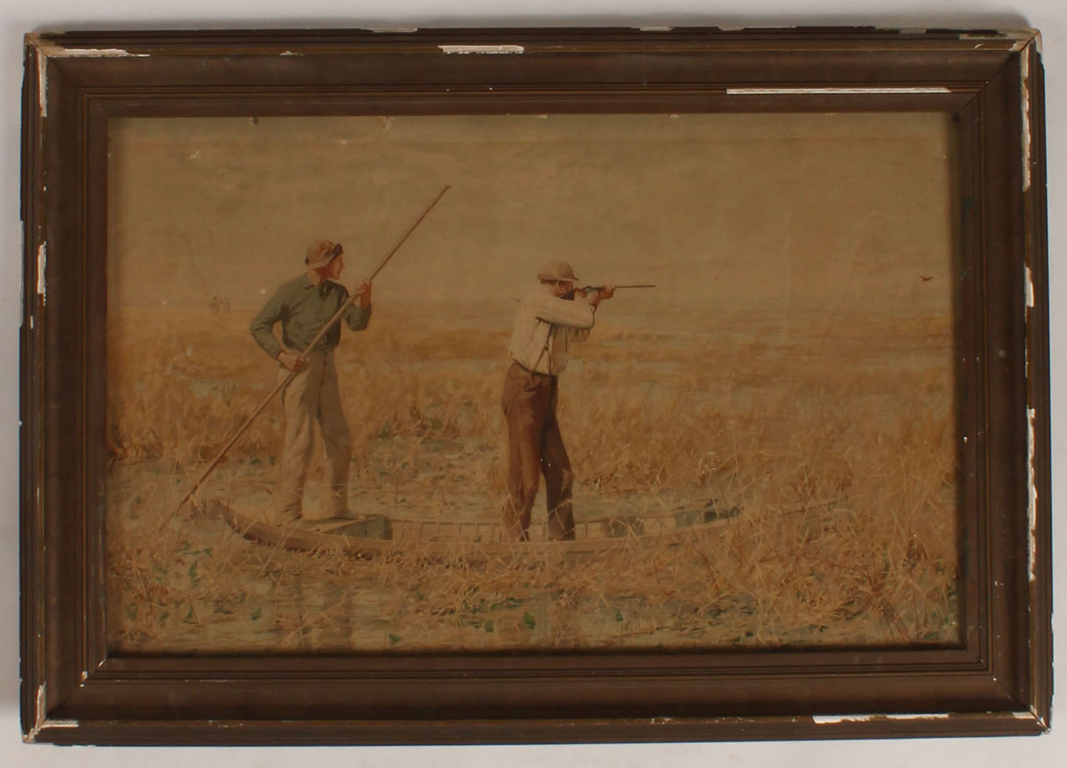 A.B. Frost full color print, pictures two snipe hunters in a boat shooting, nice colors, 19 1/2'' x 12 1/2'', framed. Grade: Very Good ++ - Value: 40 to 150