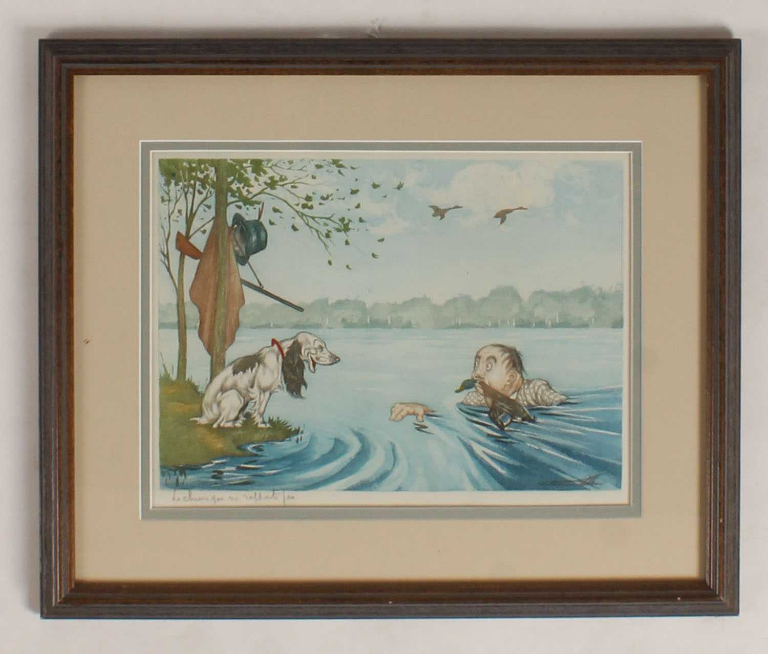 This is an original print titled ''Le Chien Qui Rapporte Pas'' (English: The Dog That Doesn't Pay Off) by Boris O'Klein, a renowned artist of the Art Deco period. Pictures a hunting retrieving dog on shore laughing at hunters swimming with duck in his mouth like a dog, 11'' x 8'' image size. It is signed by O'Klein himself and is a rare find for collectors of art prints. The print is produced using lithography technique on paper and is framed for display. The artwork captures the cartoon style of O'Klein and is a great addition to any art collection. It was produced in the 1930s. Grade: MINT - Value: 50 to 500