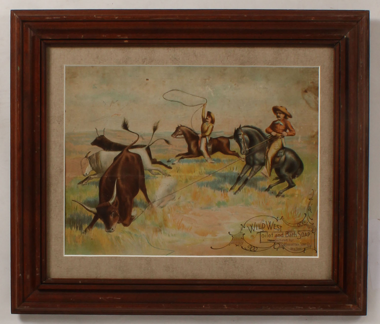 Wild West Toilet and Bath Soap by Manhattan Soap Co., pictures cowboys roping steers, 14 1/2'' x 12'', framed. Grade: Excellent - Value: 20 to 250