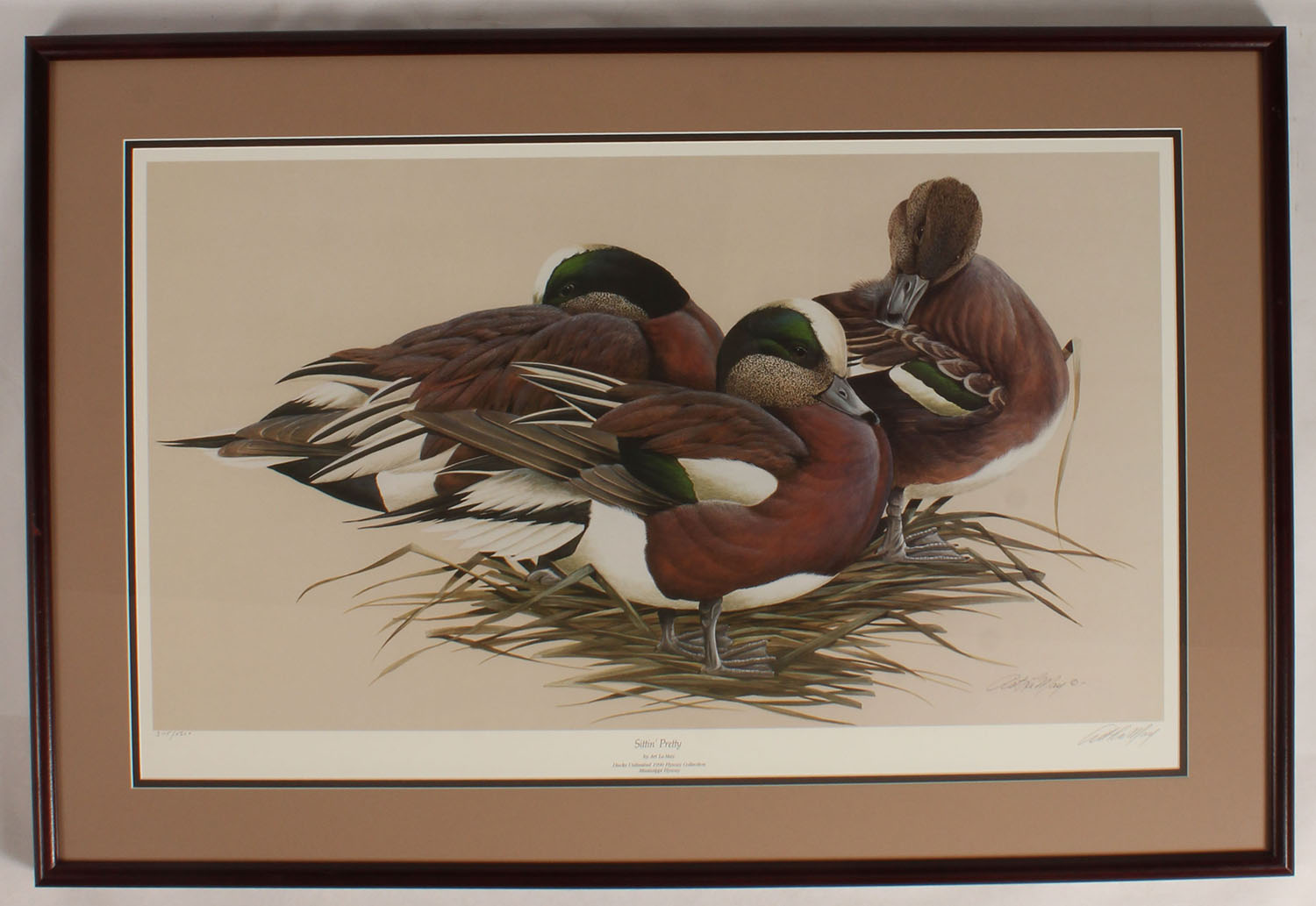 Sittin' Pretty by Art LaMay, pictures widgeon sleeping or preening, 3115/5600, 29 1/2'' x 17'' image size, framed & matted. Grade: MINT - Value: 20 to 100