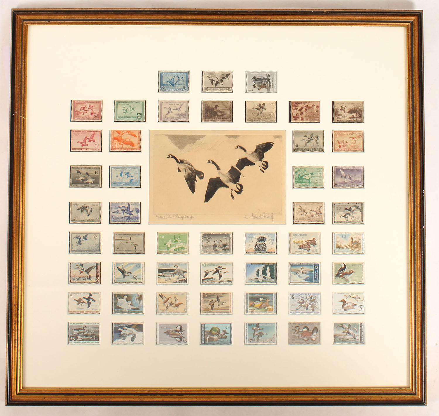 Lot of 50 Federal Duck Stamps, this first one in 1934-1983, has a center vinaigrette of the 1936 stamp which is the 3rd one by Richard Bishop, all are unsigned, 26:'' x 24'' framed size. Grade: Excellent - Value: 100 to 1000