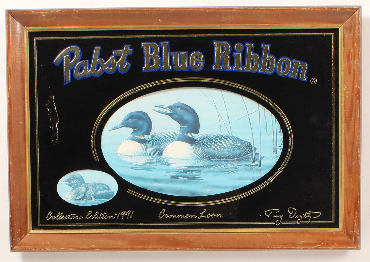 Pabst Blue Ribbon Mirror with image of loons in center, framed, 22'' x 15''. Grade: Excellent - Value: 10 to 60