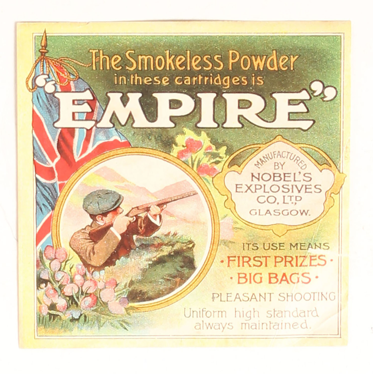 RARE Nobel's Explosives Co. EMPIRE, shotshell insert, has wonderful full colors of shooter with British flag, back is marked ''EMPIRE, THE UNEQUALLED IN BULK POWDERS'', 3 3/4'' sq, VERY RARE & ONLY ONE WE HAVE SEEN! Grade: Excellent + - Value: 200 to 1000