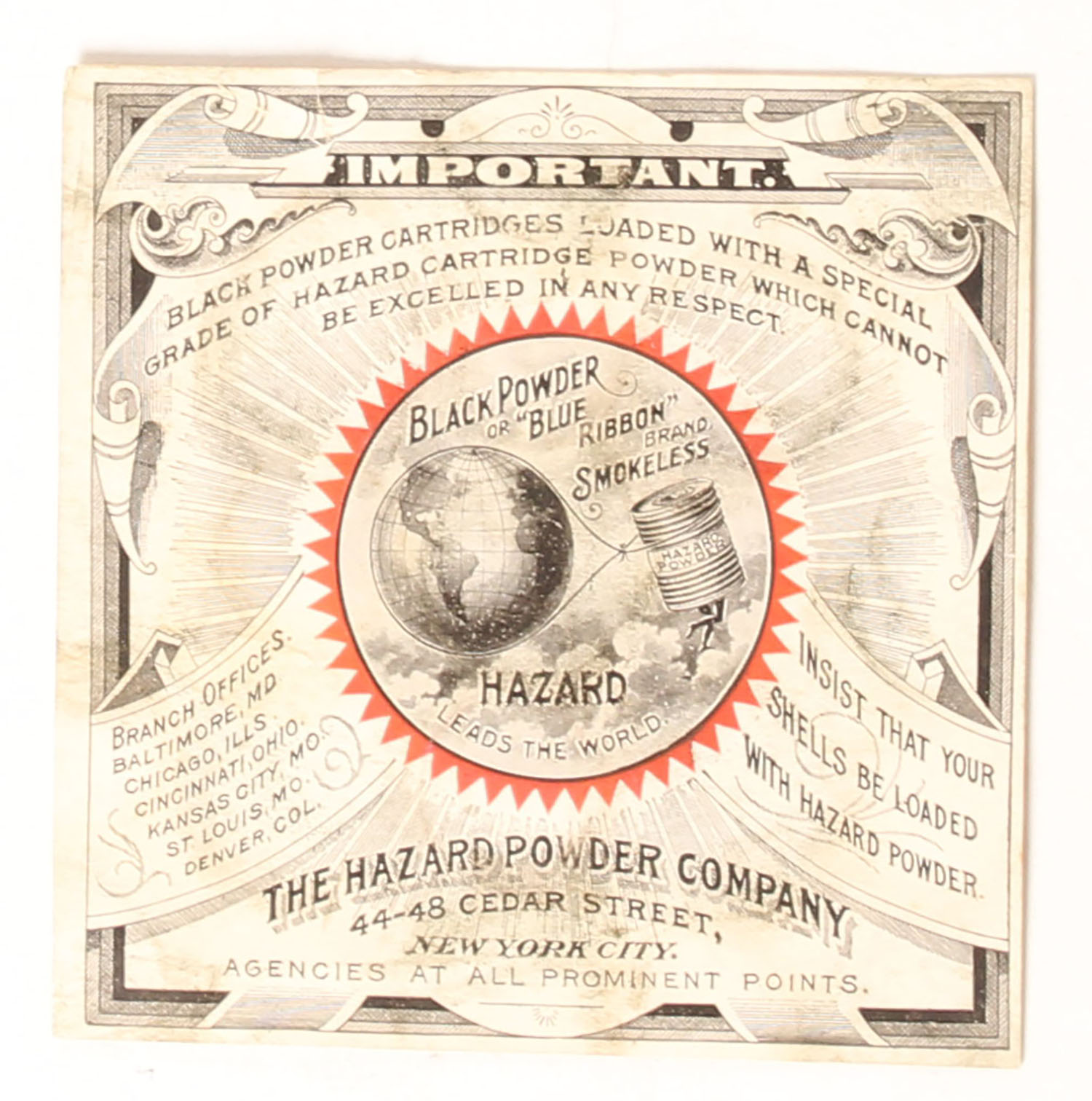 The Hazard Powder Co. Shotshell Insert, pictures powder can floating with the world globe as its ballon, 3 7/8'' sq. Grade: Excellent - Value: 50 to 300