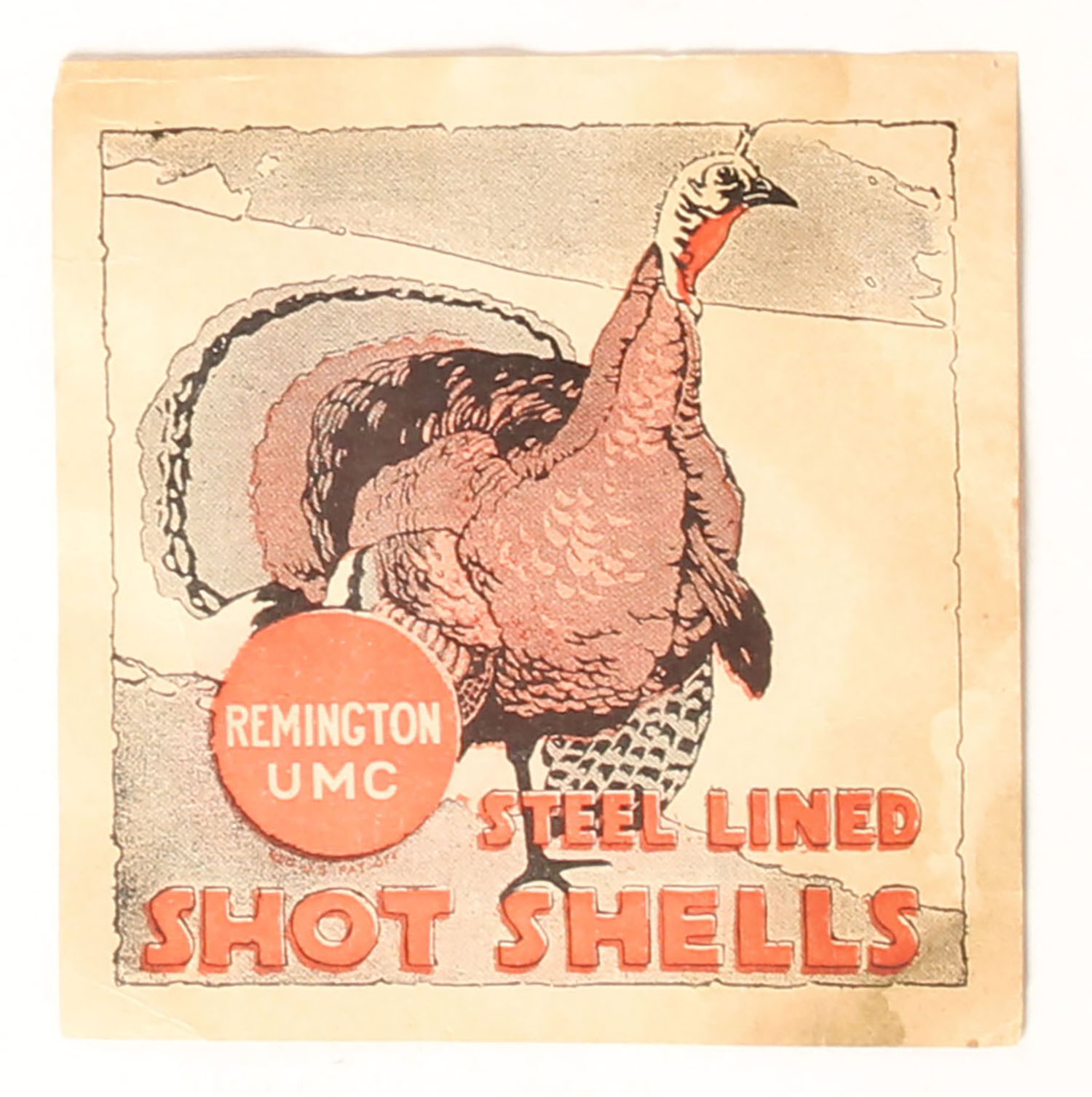 Remington UMC Steel Lined Shotshell box insert, pictures Wild Turkey, back is marked with trap shooter & words. Grade: Very Good + - Value: 30 to 200