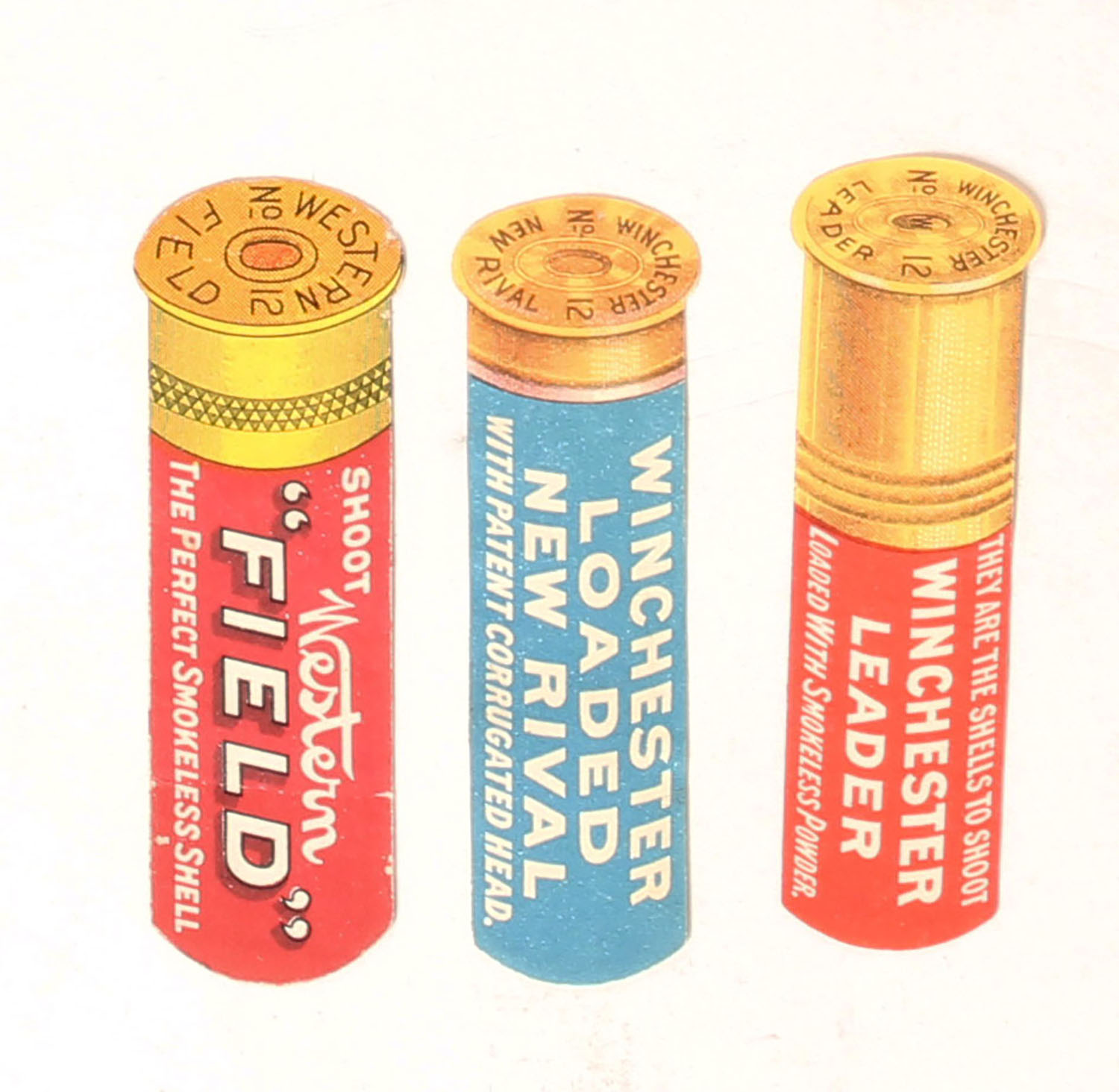 Lot of 3 Shotshell shaped inserts, Winchester or Western, very colorful, 3'' long. Grade: Excellent ++ - Value: 30 to 200