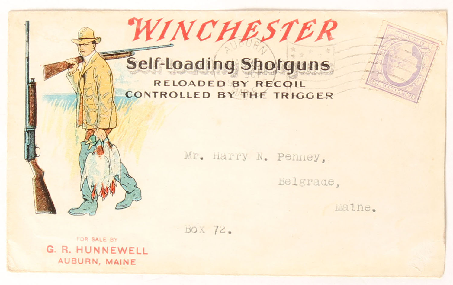 Winchester Self-Loading Shotgun Envelope, dated 190?, full color image of duck hunters with two shotguns & a limit of mallards. Grade: Excellent - Value: 30 to 100