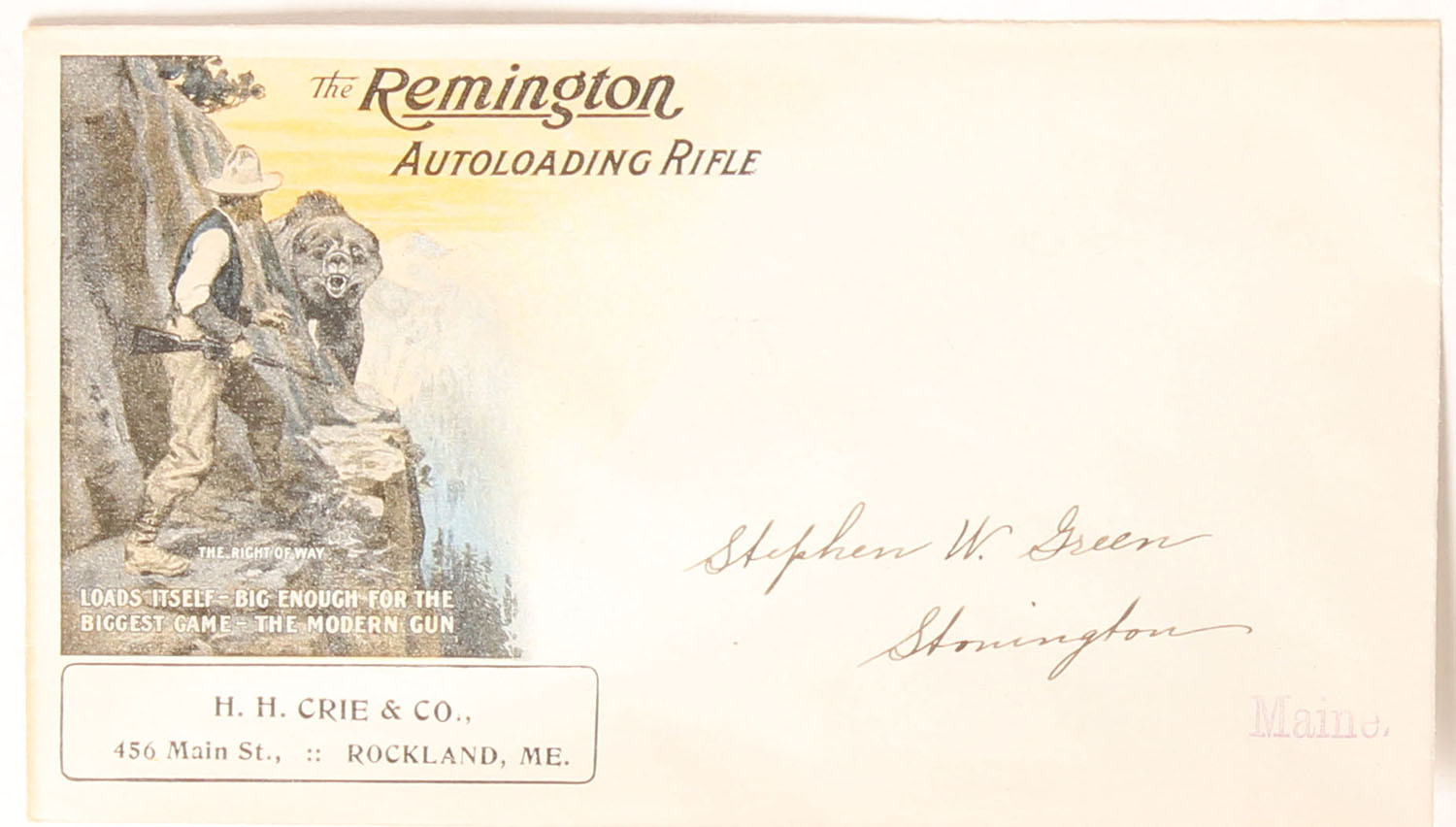 Remington Autoloading Rifle Envelope, pictures famous ''RIGHT OF WAY'', image of hunter & grizzly on cliffs edge, circa 1908, back has many items pictured, great color. Grade: Excellent ++ - Value: 30 to 100