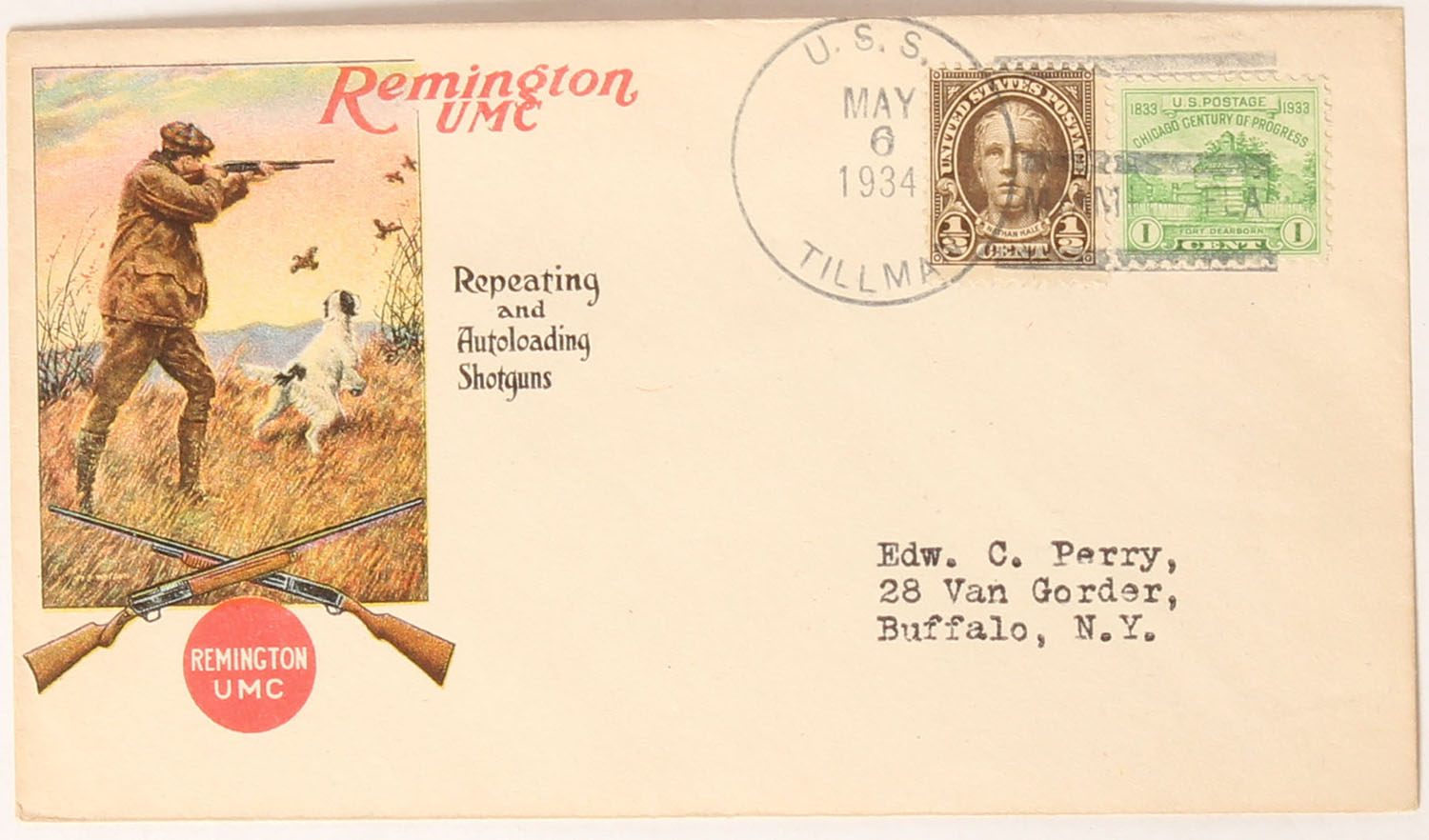 Remington UMC Repeating and Autoloading Shotguns Envelope, pictures quail hunting scene, dated 1934, back is blank, great color. Grade: Excellent - Value: 30 to 100