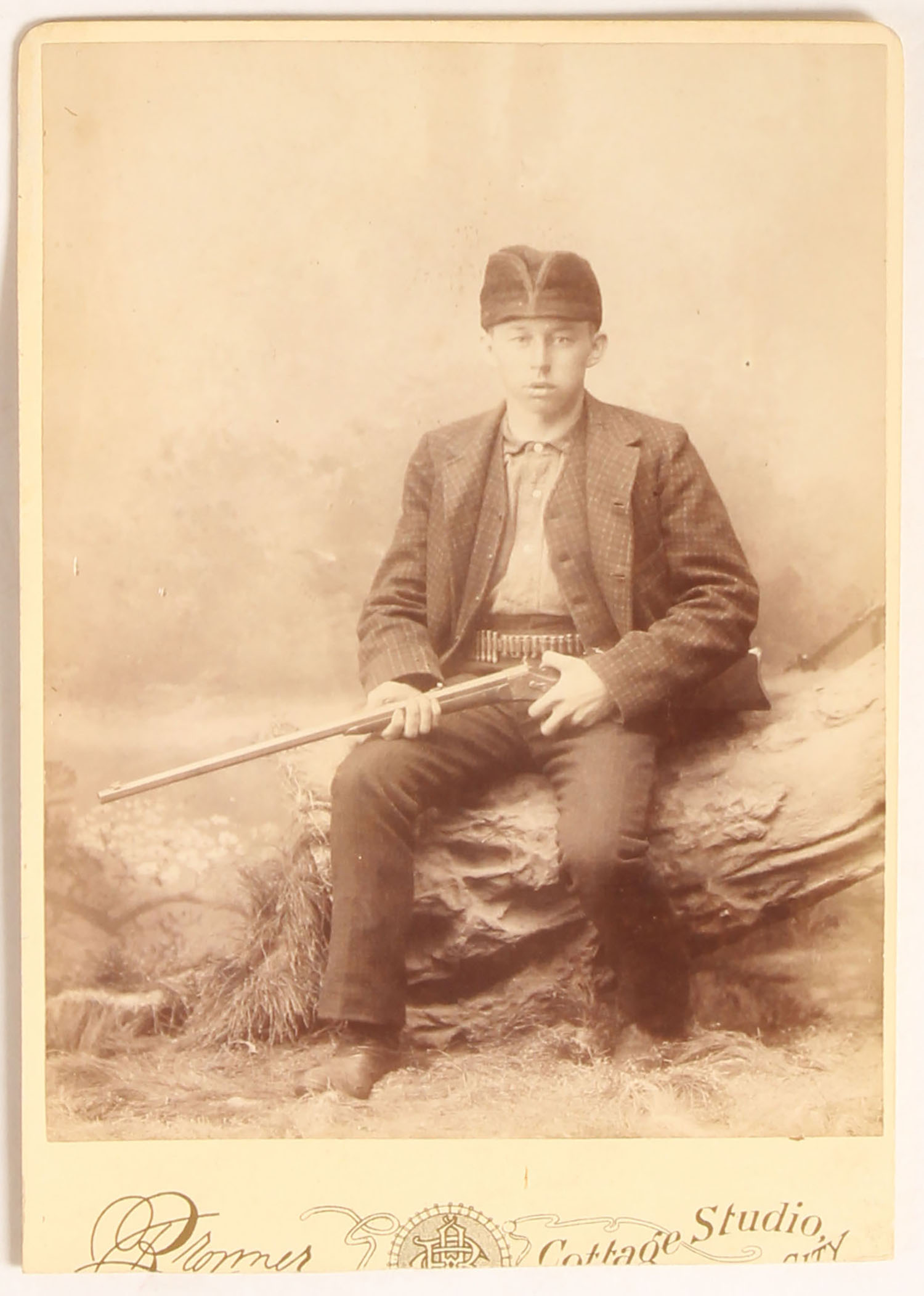 Unpublished B&W photo of a young man holding a Remington Rolling Block Sporting Rife, Circa 1880. grade: Excellent - Value: 40 to 150