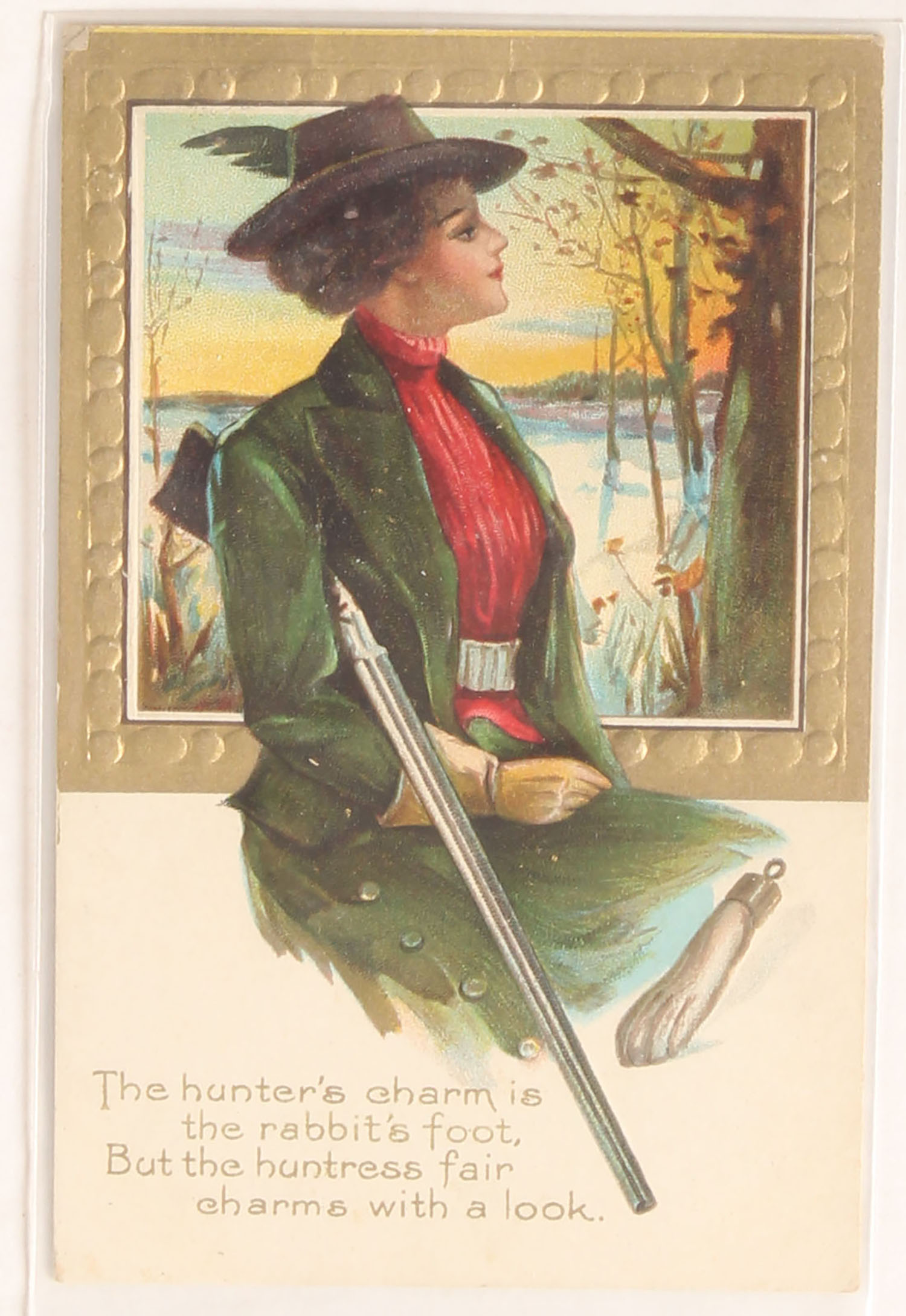 Postcard pictures a lady in long green coat holding a shotgun, unused. Grade: Excellent + - Value: 10 to 50
