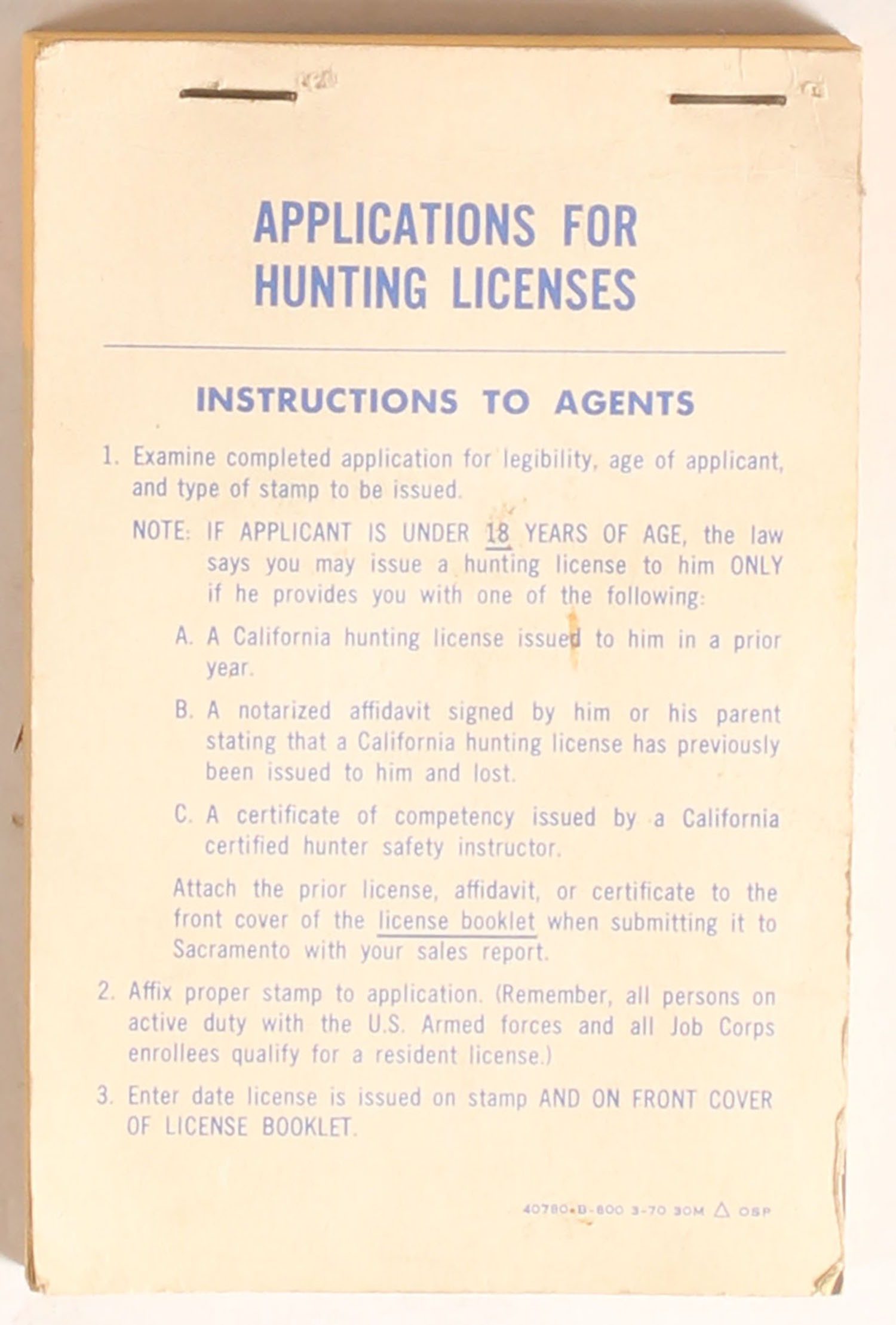 1970 full booklet of Calif. Hunting Lic, all are unused. Grade: MINT - Value: 2 to 30