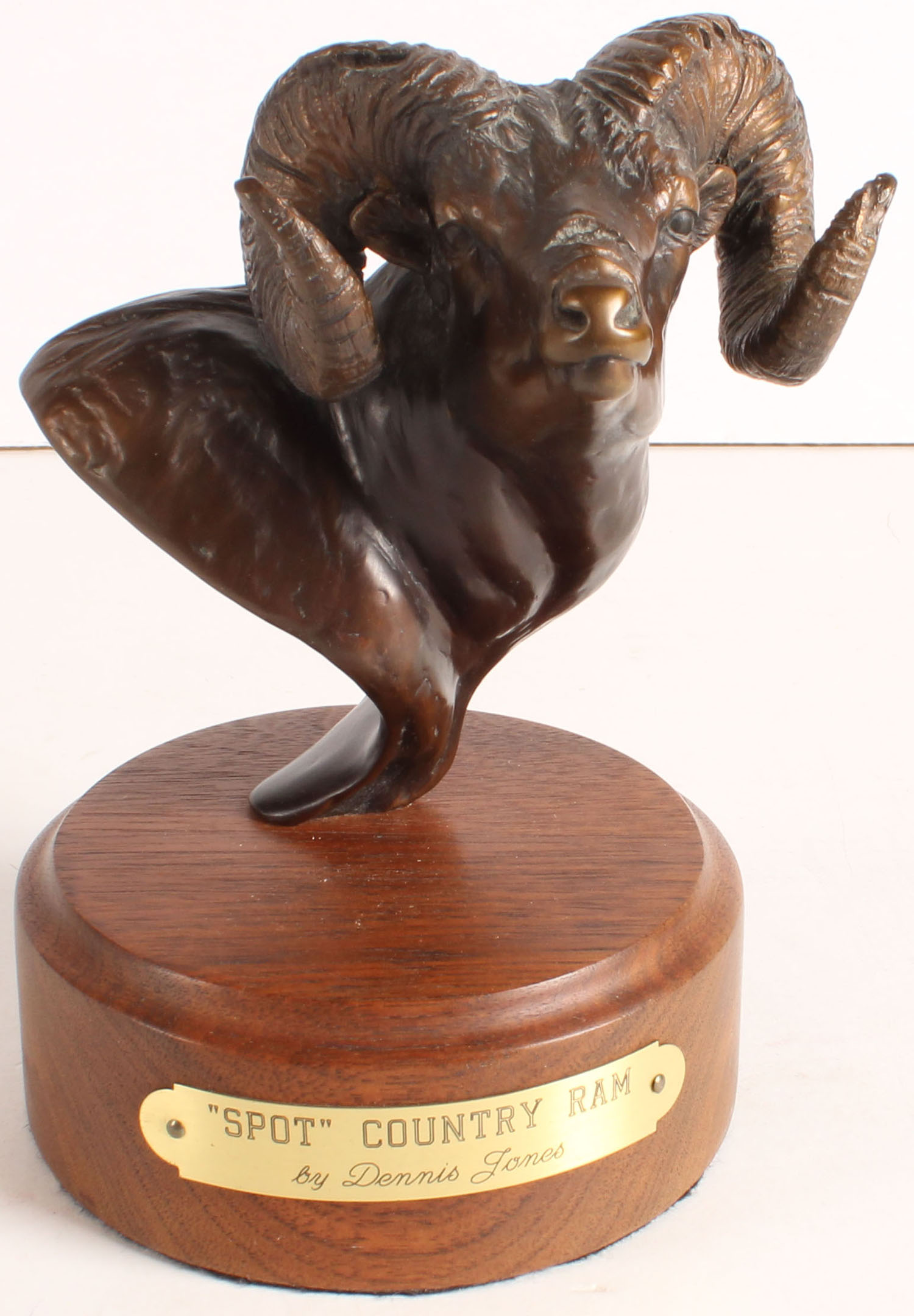 Dennis Jones SPOT COUNTRY RAM bronze statue, full curl ram on wood base, 3/100, 5'' x 7'' x 4''. Grade: Excellent ++ - Value: 100 to 300