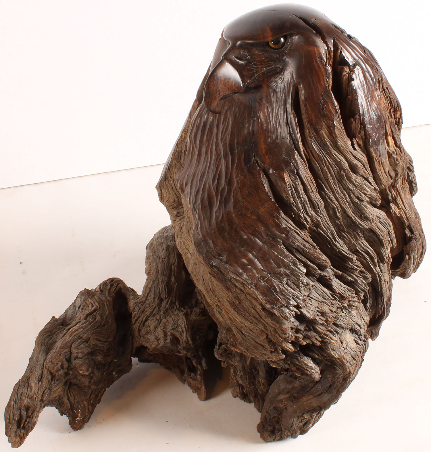 Mexican Ironwood Rapto Head by Dale Crawford, the top of head is polished smooth, glass eyes, 19'' x 14'' x 10''. Has lazy susan base (not photo'd). Grade: Excellent - Value: 100 to 400