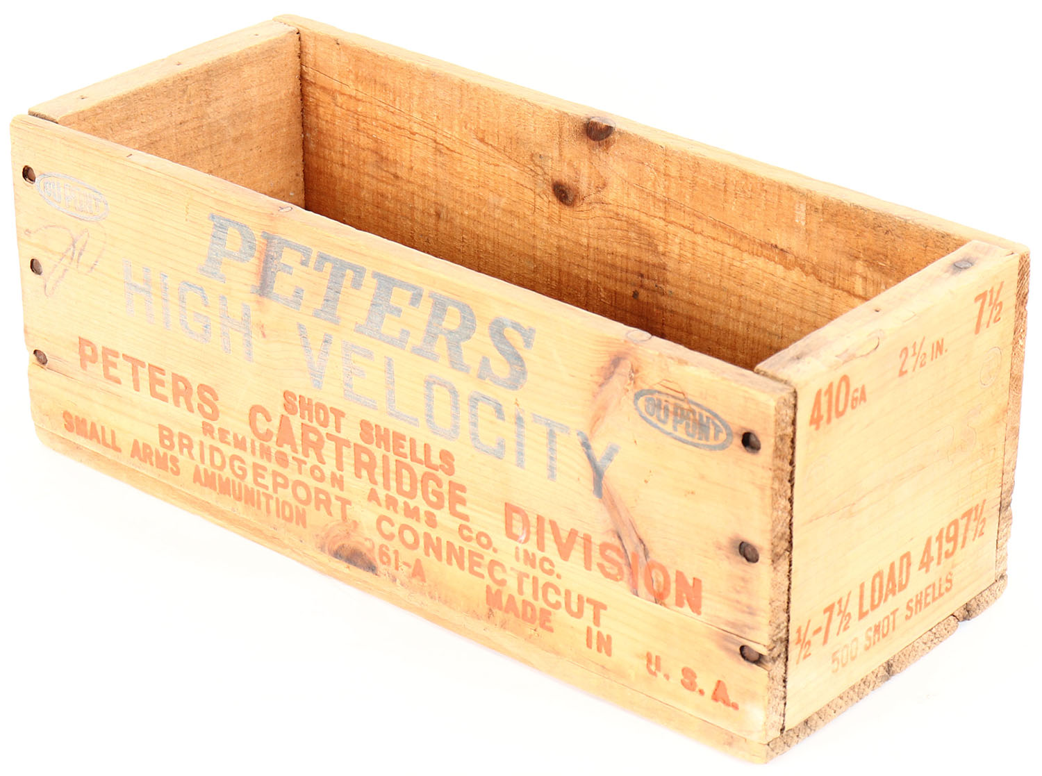 Peters wood shipping crate, High Velocity, 410 ga., 7 1/2 shot, nail construction, blue & orange print is fading, crate has soiling, Grade: Very Good + - Value: 30 to 90