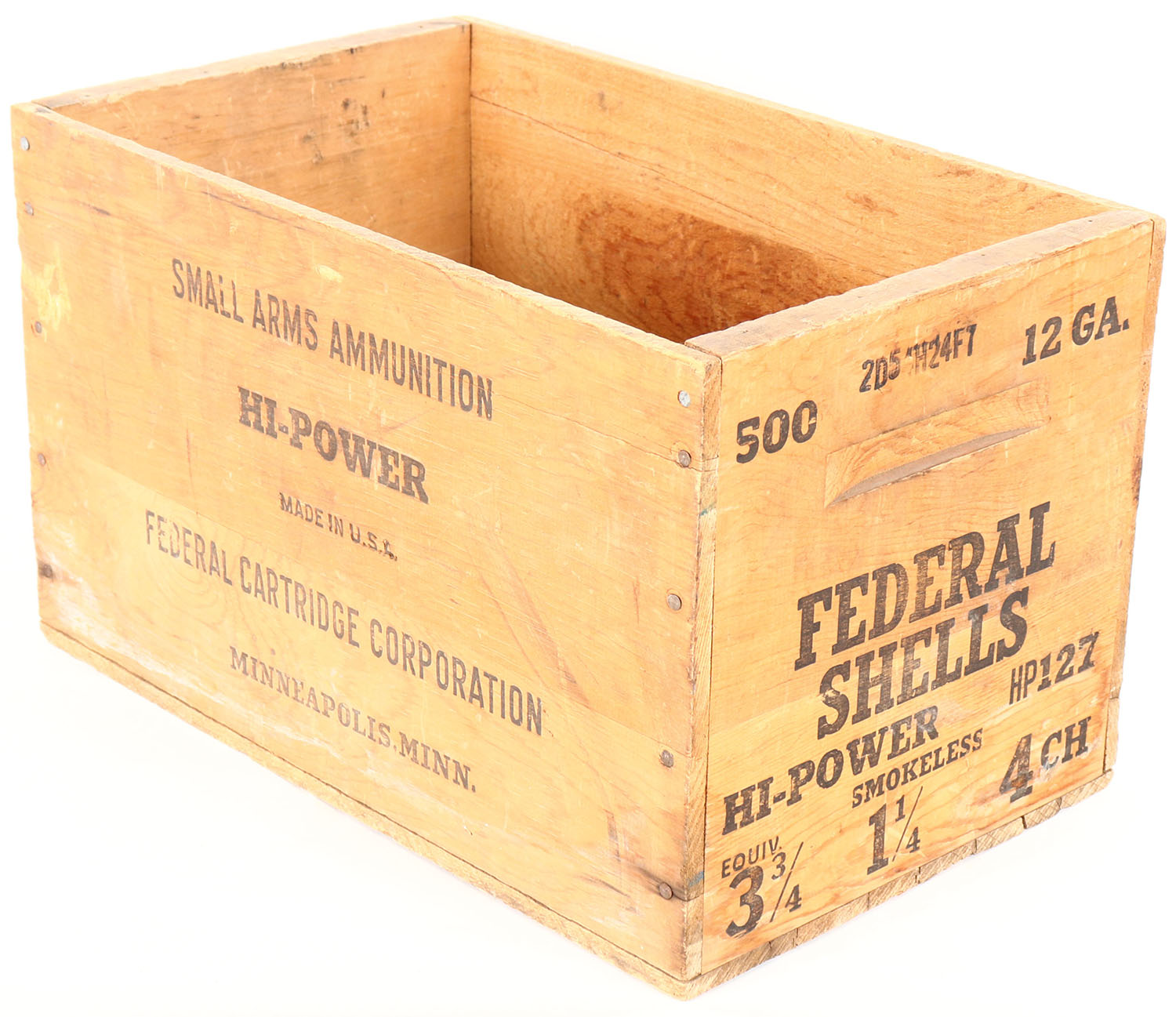 Federal MONARK wood shipping crate, 12 ga., 4 shot, black print is solid, crate has soling. Grade: Very Good ++ - Value: 10 to 50