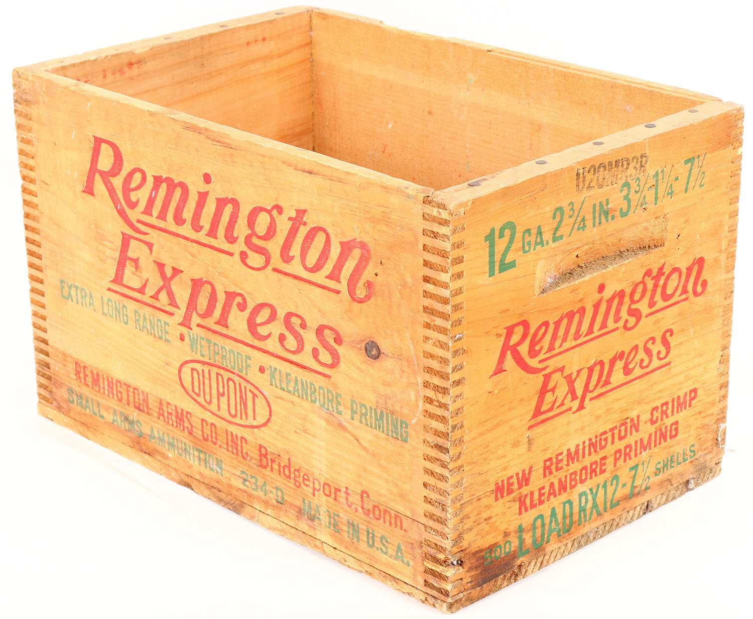 Remington Kleanbore Express, 12 Ga., nail construction, red, & green print and crate is solid. Grade: Excellent - Value: 10 to 50