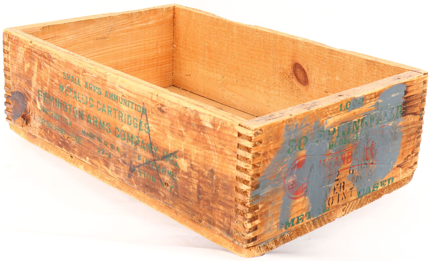 Remington, .30 Springfield, tongue and groove construction, red, & green print is solid and crate is solid. Grade: Very Good ++ - Value: 10 to 50