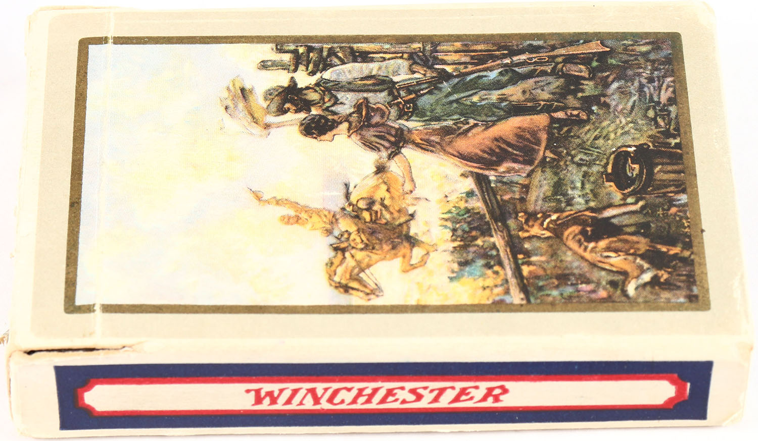 RARE! EARLY deck of Winchester cards, FULL DECK, beautiful image on the back of every card, some soiling to cards but still solid, box has slight tear to top seams but still nice, great color! Grade: Excellent - Value: 50 to 200