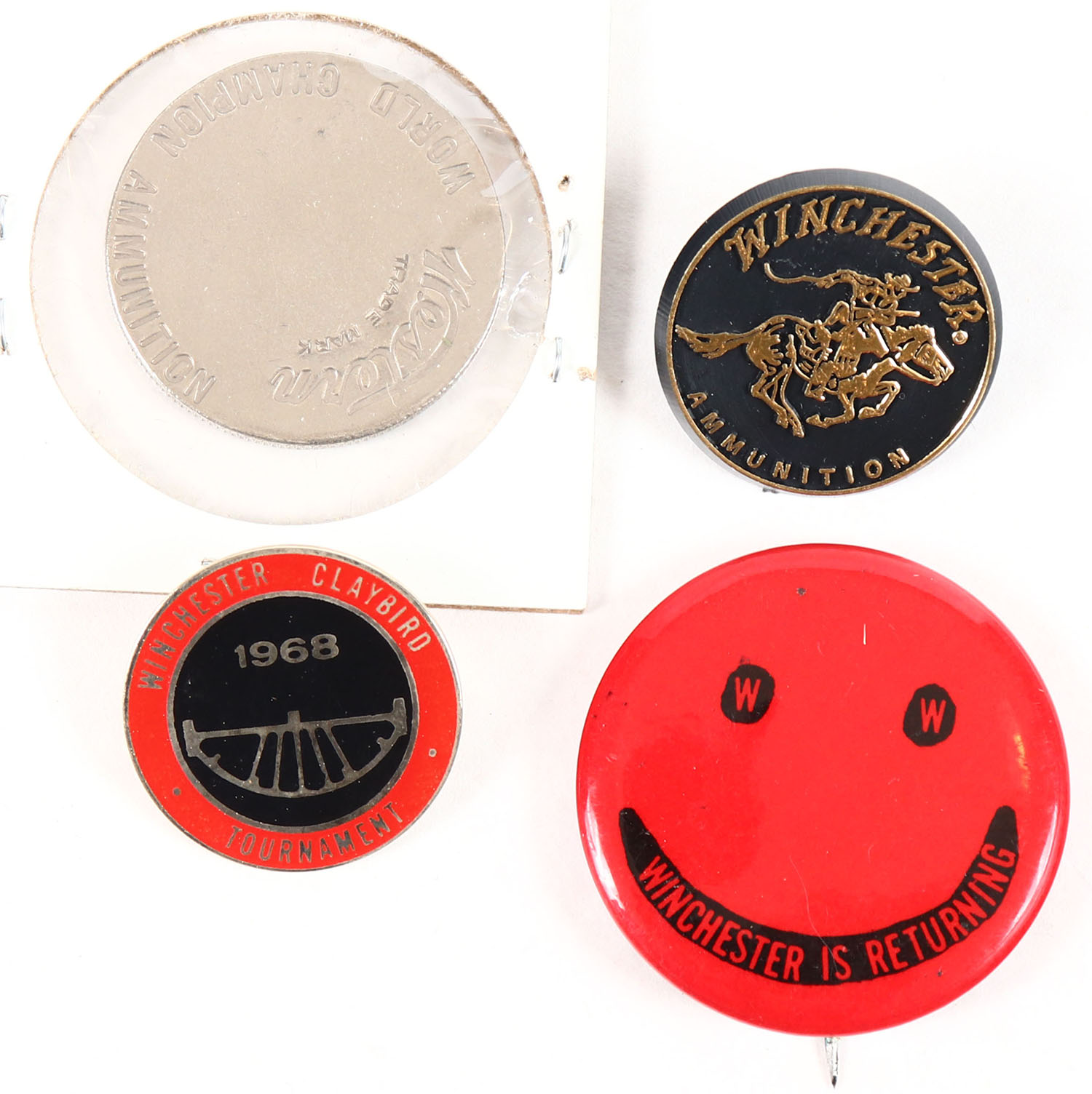 Lot of Winchester pinbacks and coin. Grade: Excellent - Value: 4 to 40