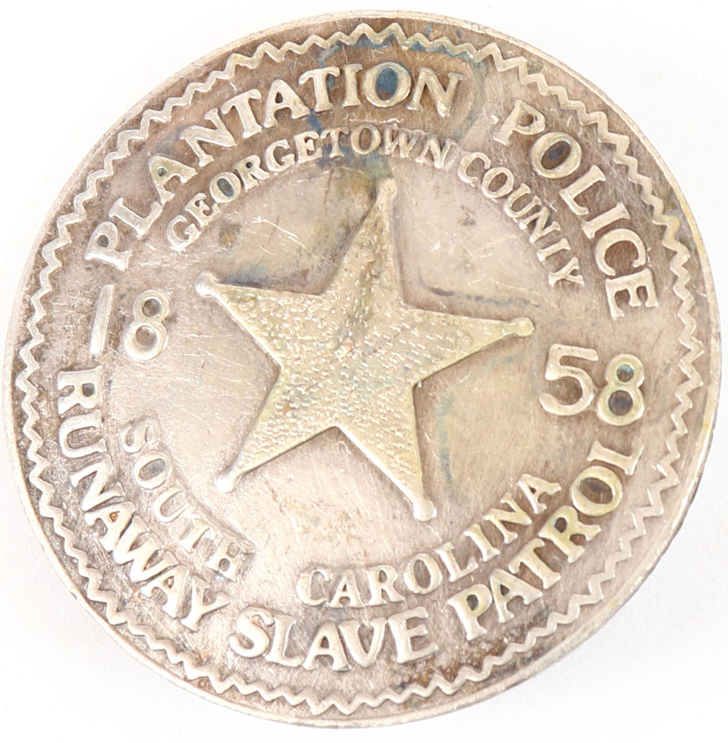 RARE! Plantation Police Badge dated 1858. Grade: Very Good - Value: 50 to 400
