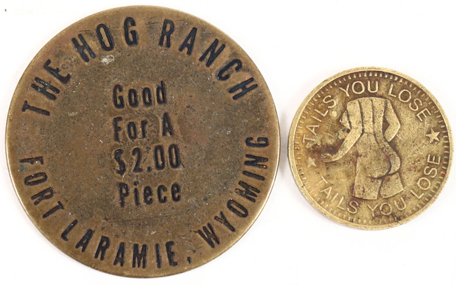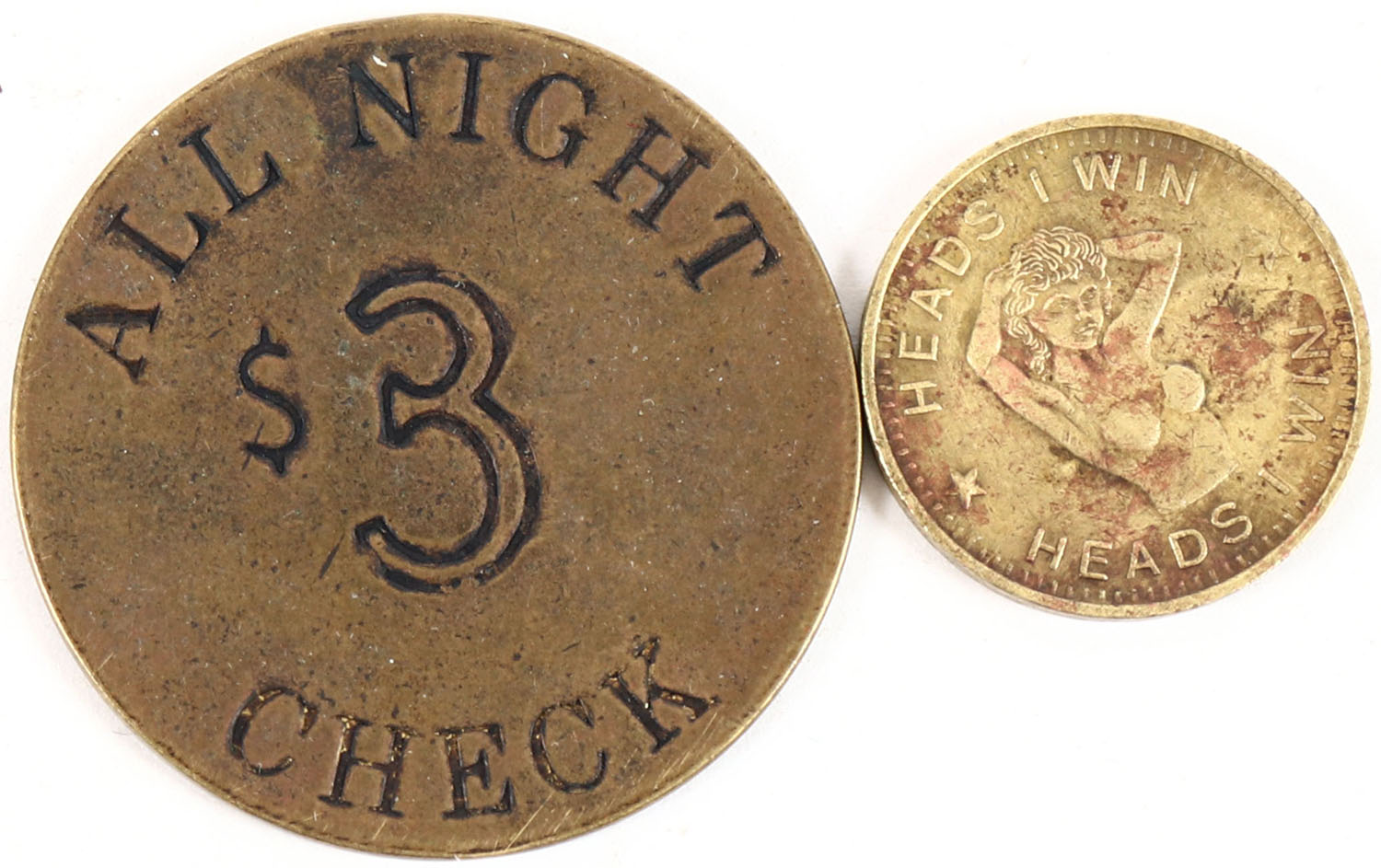 Lot of 2 double sided token, heads or tails naked lady token, and brothel token. Grade: Very Good ++ - Value: 20 to 100
