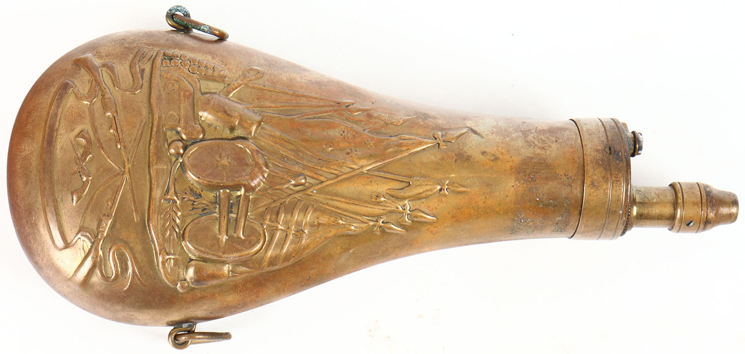 RARE! Early Brass Powder flask, unmarked with beautiful design, all still solid! Grade: Very Good ++ - Value: 40 to 200