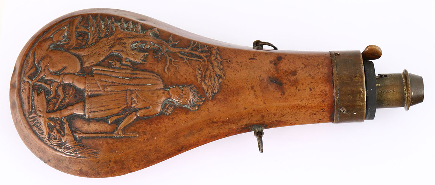 RARE! Early Brass Powder flask, unmarked with beautiful design, all still solid! Grade: Very Good - Value: 40 to 100