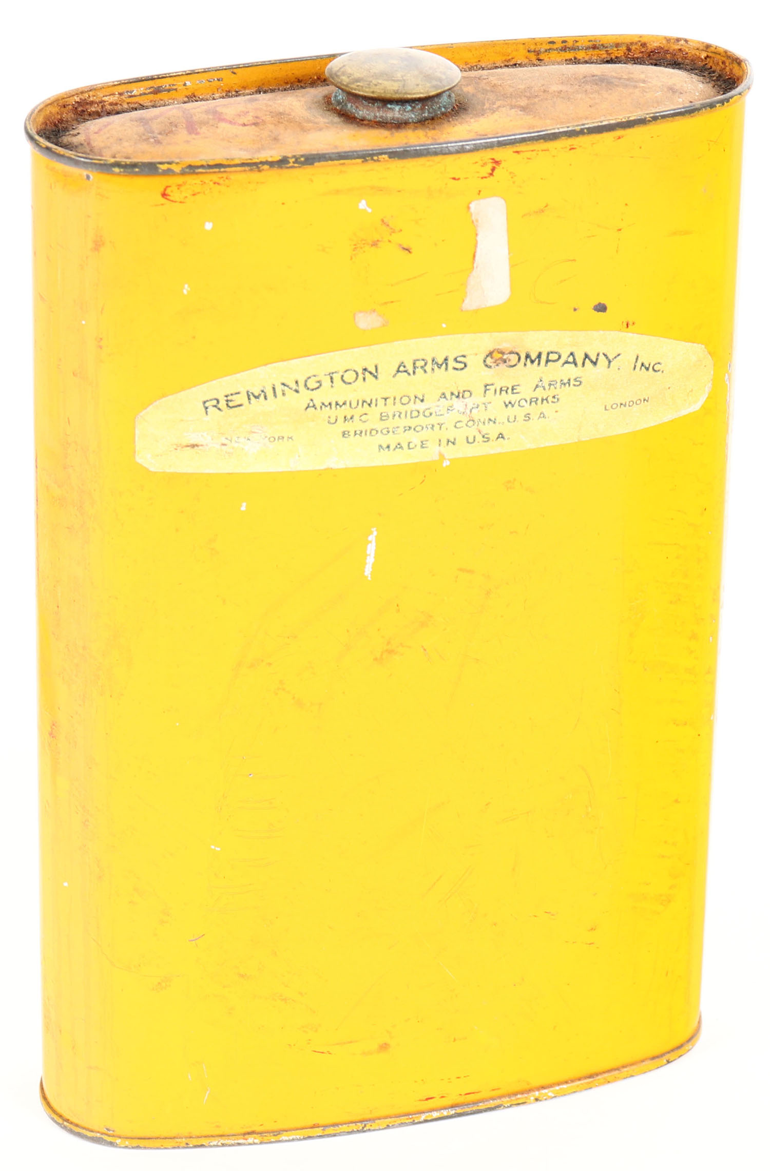 Remington Arms Co. Gunpowder tin, partial, orange tin with small white label, some scuffing but still solid. Grade: Very Good ++ - Value: 40 to 150