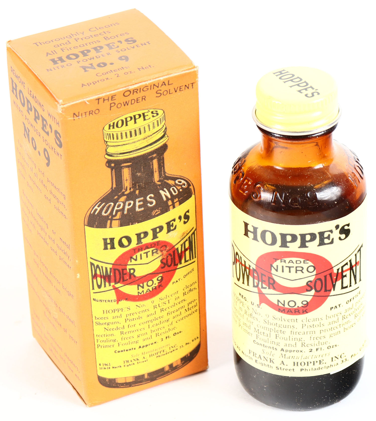 Hoppes Gun Oil glass jar, in box, FULL, bright and clean. Grade: Excellent - Value: 6 to 50