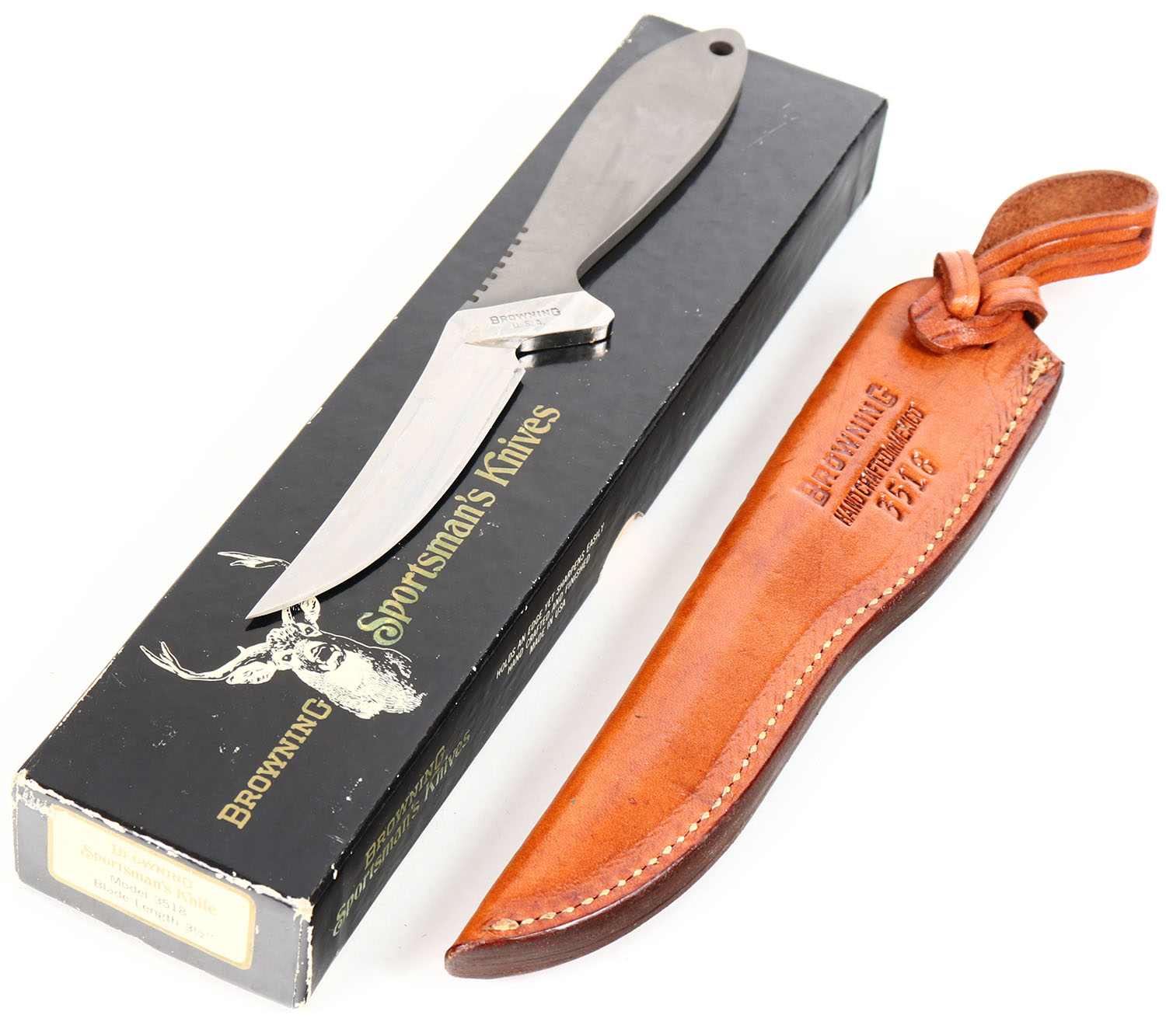 Browning sportsman's knife, Model 3518, has cardboard box and leather sheath. Grade: Excellent ++ - Value: 20 to 80