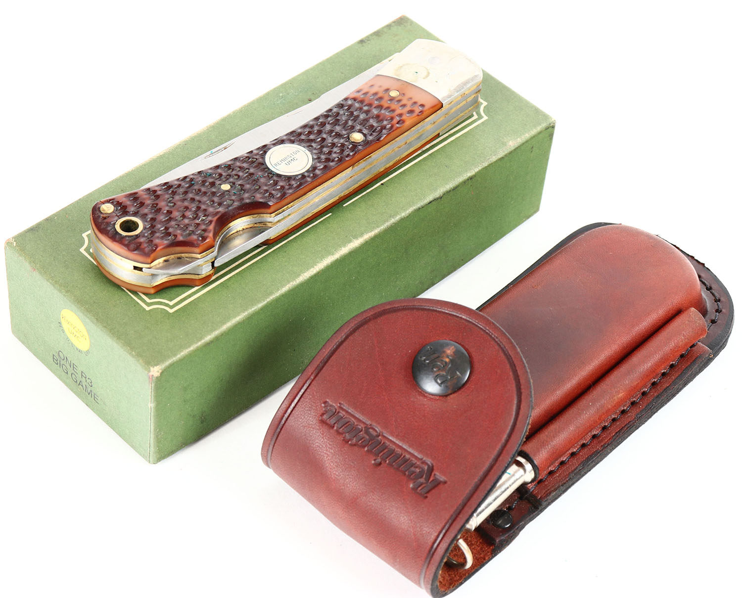 Remington UMC knife, One R3 Big Game, has cardboard box and leather sheath. Grade: Excellent ++ - Value: 16 to 50