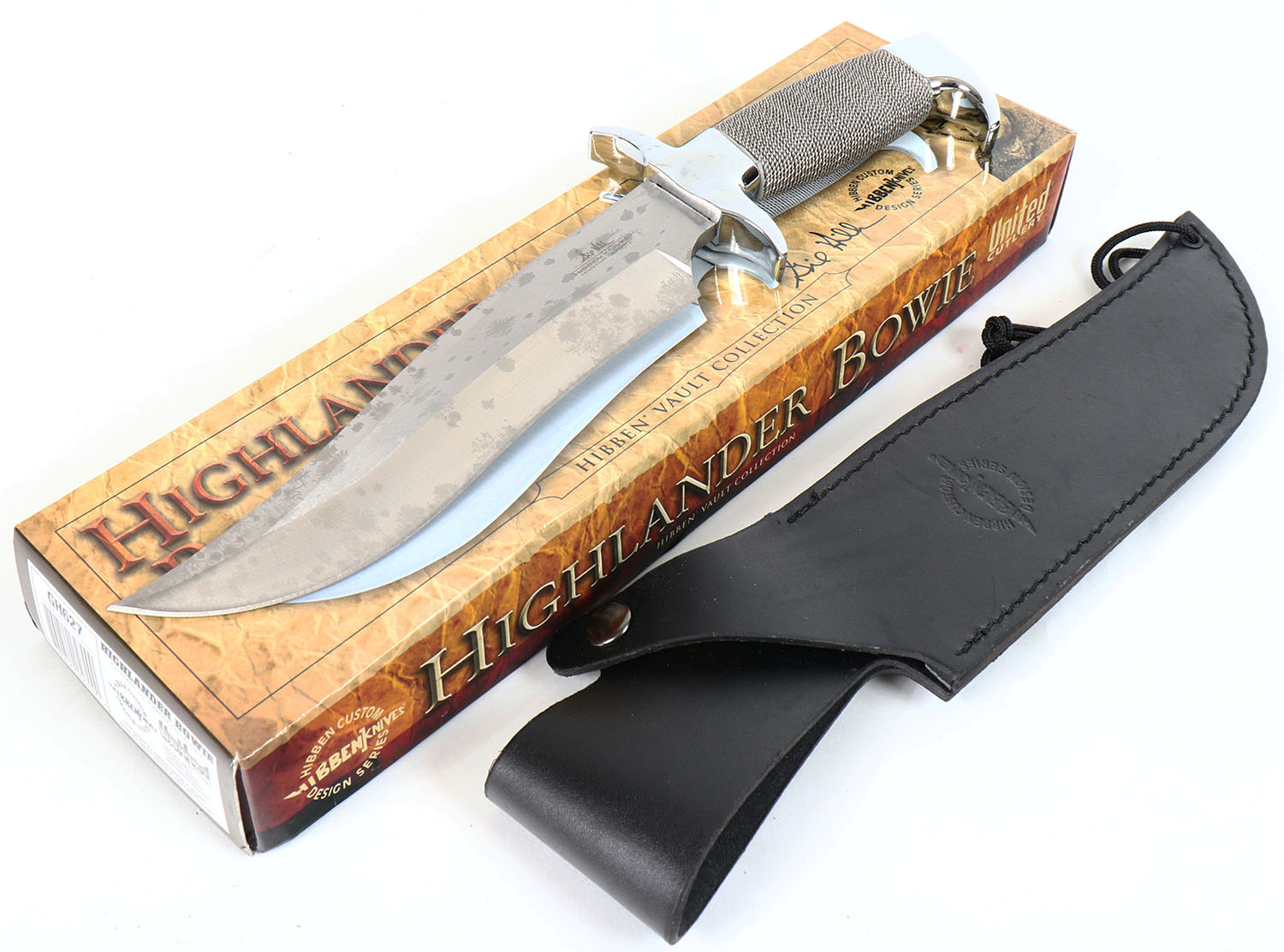 LARGE Highlaner Bowie knife, has leather sheath, in original box. Grade: Excellent ++ - Value: 20 to 80