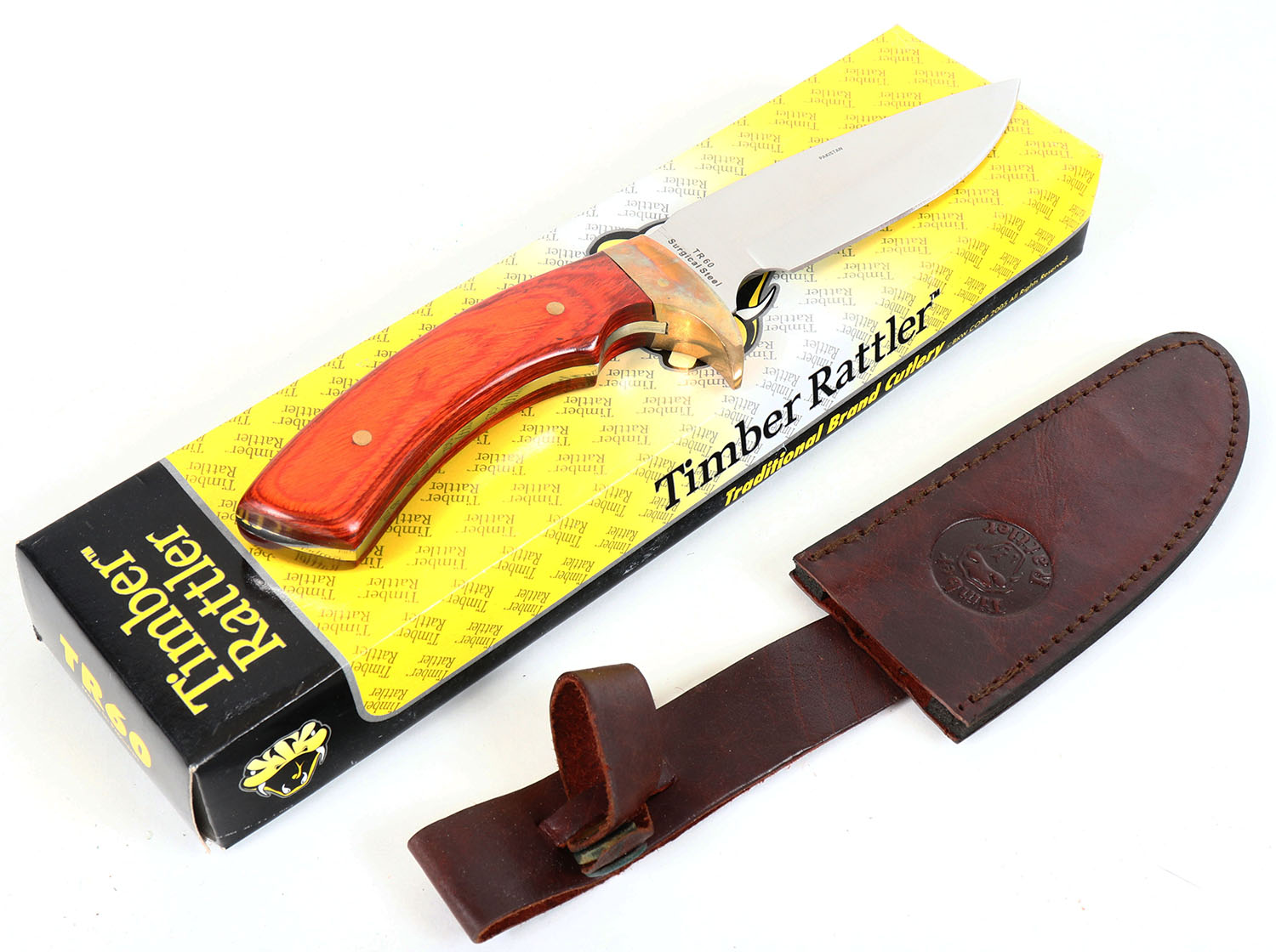 LARGE Timber wolf timber rattler knife, TR60, has leather sheath, in original box. Grade: Excellent ++ - Value: 16 to 60
