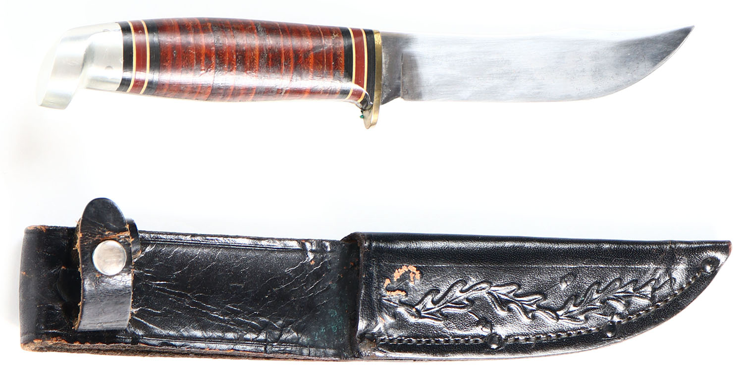 Western Model L66 knife, 4'' blade, has sheath, leather stacked handle, aluminum pommel, circa 1950s. Grade: Excellent - Value: 20 to 60