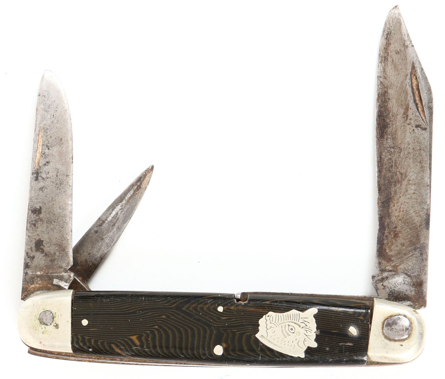 Cant read manf. knife, has buffalo head logo, multi blades, has age soiling. Grade: Very Good ++ - Value: 10 to 100