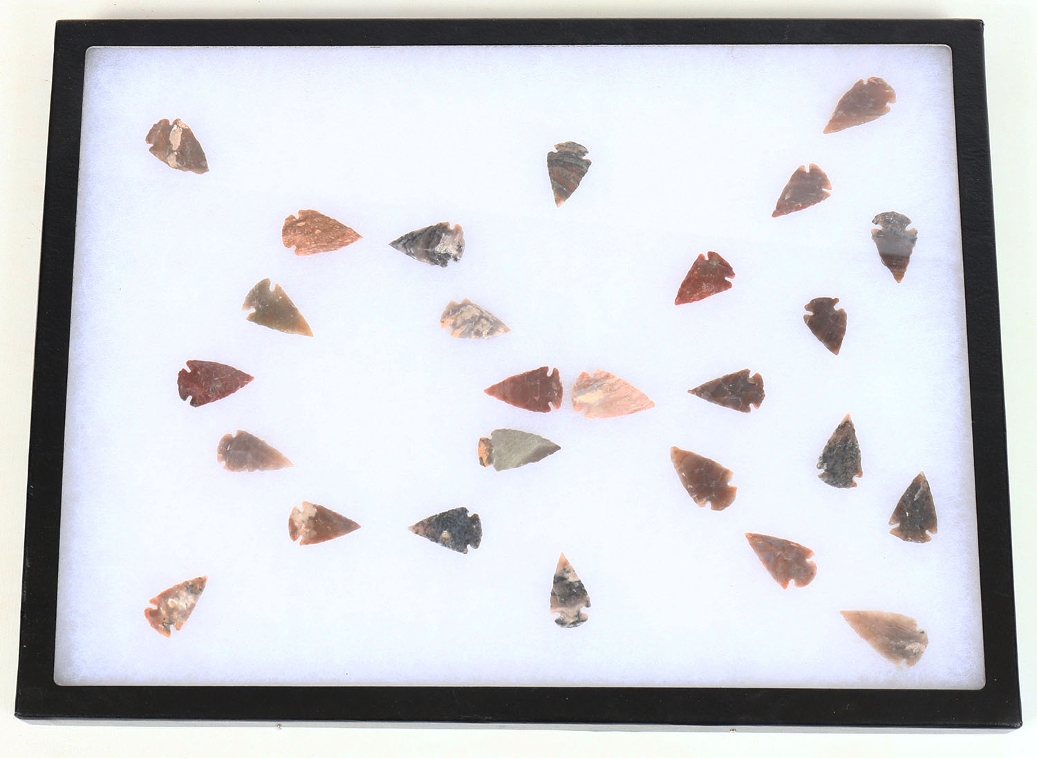 Lot of 26 MINT arrowhead collection, all gem quality flint, in glass display. Grade: Excellent - Value: 50 to 300