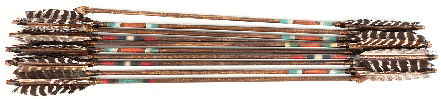 Large lot of handmade Native American arrows, flint tip with bird feathers and well made! Grade: Excellent - Value: 20 to 200