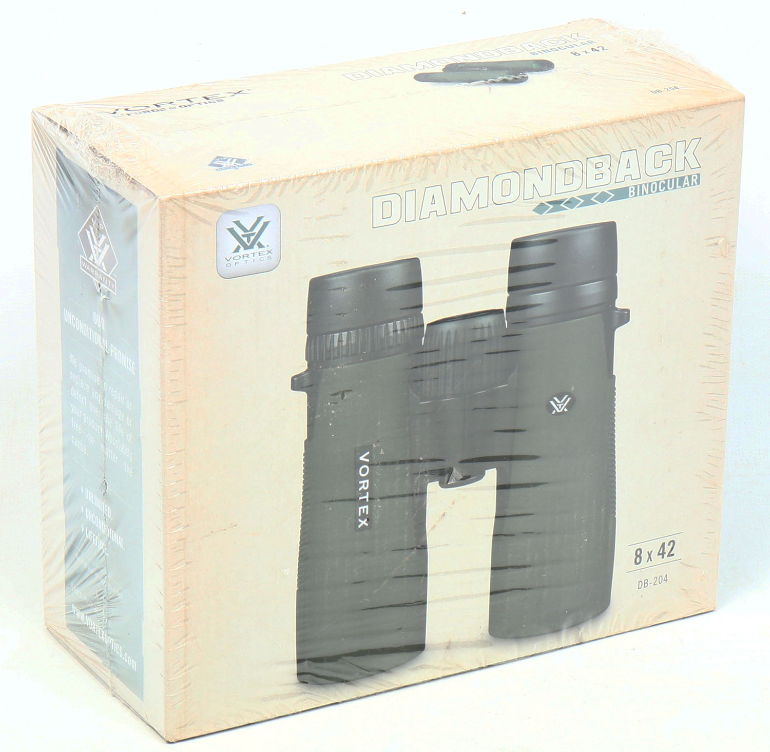Vortex, Diamondback, 8x42 Binocular, NIB, comes with carrying case, neck strap, rain guard eyepiece cover, tethered lens covers, and lens cleaning cloth. Grade: MINT - Value: 50 to 200