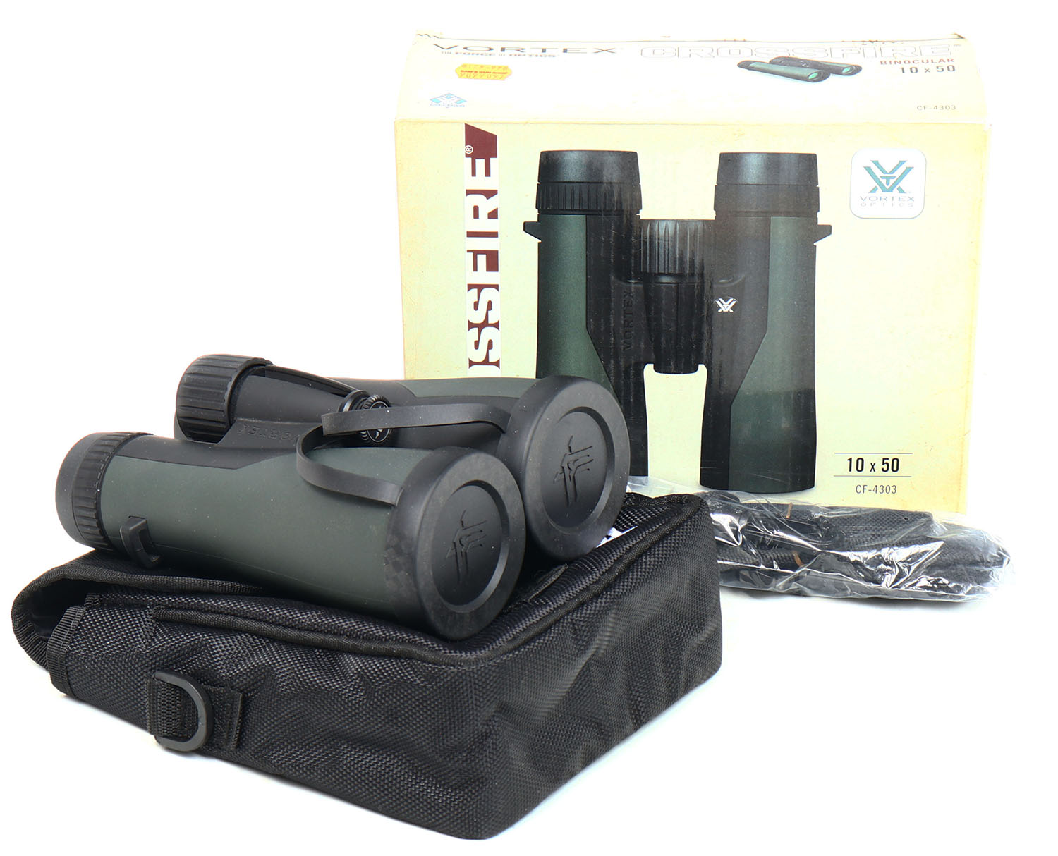 Vortex, Crossfire, 10x50 Binocular, NIB, comes with carrying case, neck strap, rain guard eyepiece cover, tethered lens covers, and lens cleaning cloth. Grade: MINT - Value: 100 to 500