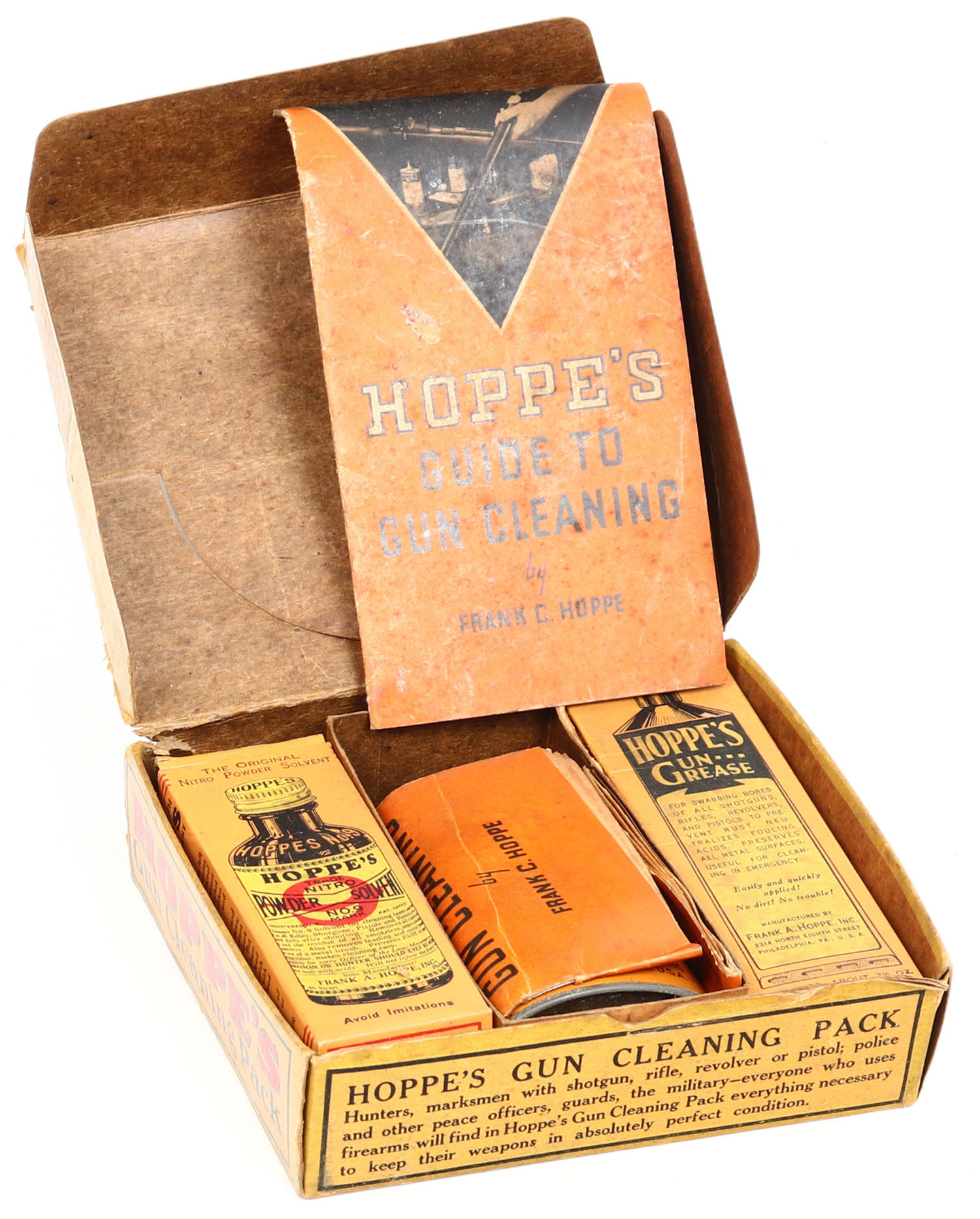 Hoppes Gun cleaning kit, FULL with oil tin, with cleaning patches, has age soiling Grade: Very Good + - Value: 10 to 50