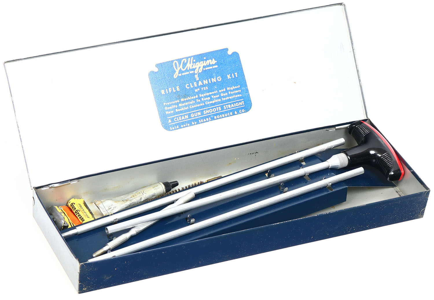 JC Higgins rifle cleaning kit, No 727, NO oil tin, with cleaning patches, has age soiling Grade: Very Good + - Value: 2 to 20
