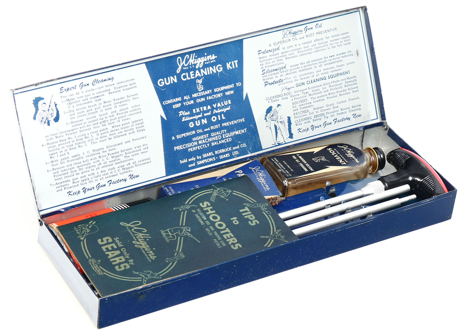 JC Higgins rifle cleaning kit, FULL with oil tin, with cleaning patches, has age soiling Grade: Very Good + - Value: 4 to 40