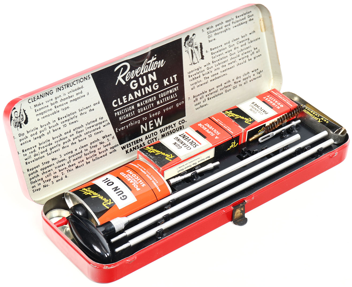 Revelation rifle cleaning kit, .30 cal., Full with oil tin, with cleaning patches, solid. Grade: Excellent - Value: 10 to 50