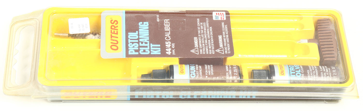 Outers pistol cleaning kit, .22 cal., Full with oil tin, with cleaning patches, solid. Grade: Excellent - Value: 2 to 40